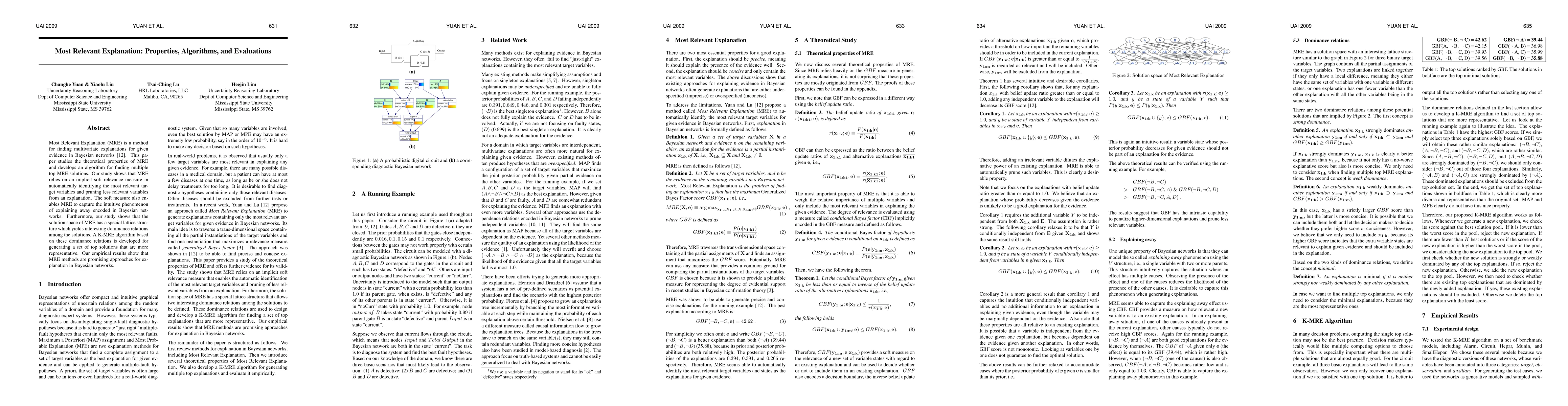 This paper explores the theoretical properties of Most Relevant Explanation (MRE) in Bayesian networks, develops an algorithm for identifying top MRE solutions, and demonstrates its effectiveness through empirical evaluations. The MRE method uses a soft relevance measure to identify relevant variables and exhibits a lattice structure in its solution space, leading to a K-MRE algorithm that generates representative top solutions.