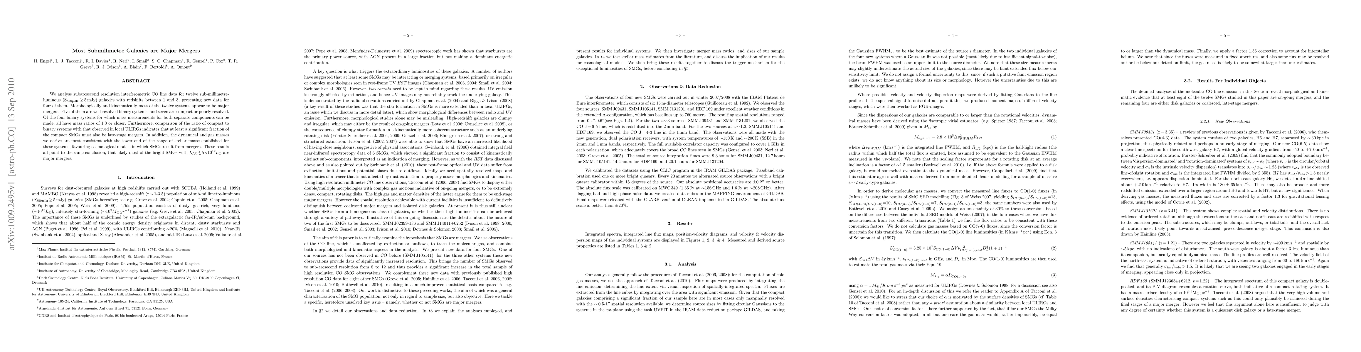 This study, analyzing high-resolution CO line data of 12 submillimetre-luminous galaxies, concludes that most are major mergers. The findings reveal that 11 out of 12 systems show merger characteristics, with 5 being well-resolved binary systems and 7 being compact or poorly resolved. Mass ratio analysis and comparison with local ULIRGs suggest late-stage merger status for compact SMGs. Dynamical and gas masses align with lower stellar mass estimates, supporting cosmological models where SMGs originate from mergers.