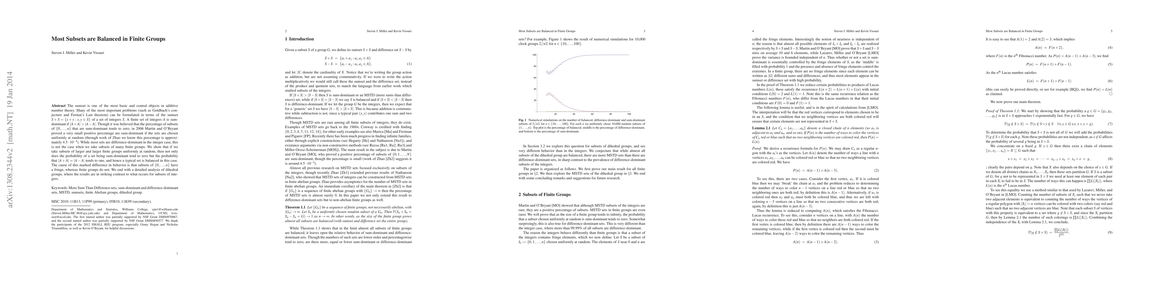 This paper demonstrates that in larger finite groups, random subsets are nearly always balanced, meaning the size of their sumset equals the size of their difference set, unlike in integer sets. The reason lies in the absence of a 'fringe' in finite groups. The study contrasts this with dihedral groups, showing stark differences from integer set behaviors.