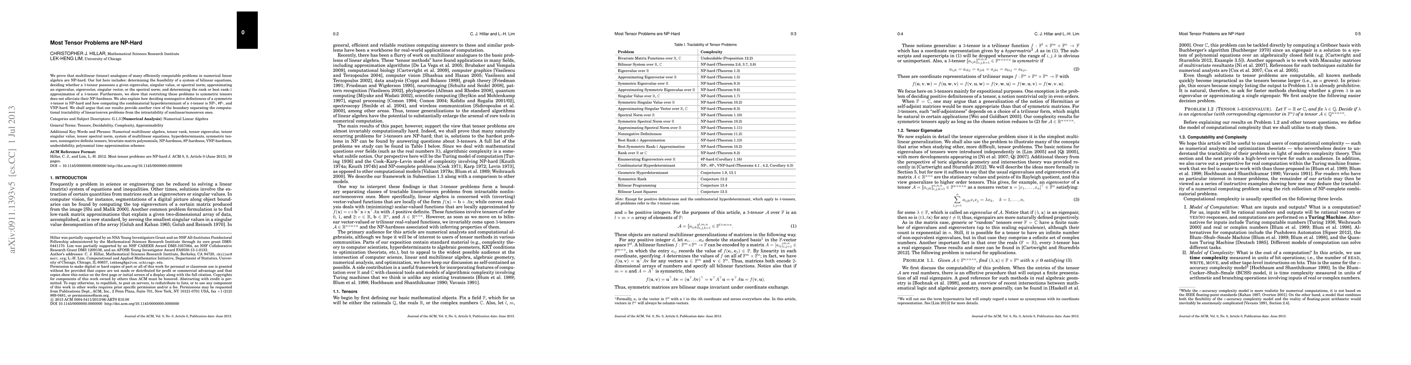 This paper demonstrates that numerous tensor problems analogous to efficiently computable linear algebra tasks are NP-hard, including feasibility of bilinear equations, tensor eigenvalue/singular value determination, and rank approximation. The study also shows that these problems remain NP-hard even when restricted to symmetric tensors, highlighting the computational boundary between tractable linear problems and intractable nonlinear ones.
