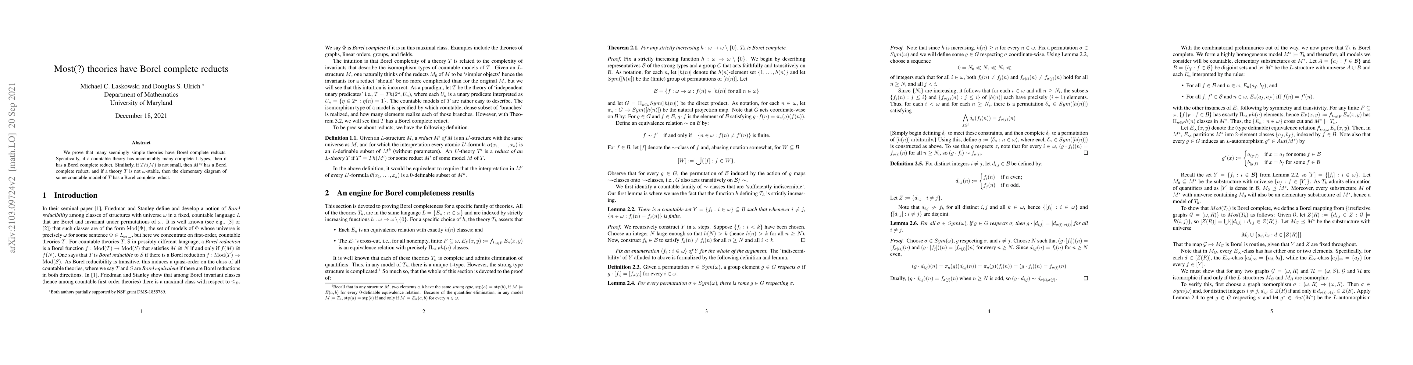 This paper proves that numerous countable theories with specific properties, such as having uncountably many complete 1-types, not being small, or not being ω-stable, possess Borel complete reducts. These findings extend the understanding of the structure of simple theories in mathematical logic.
