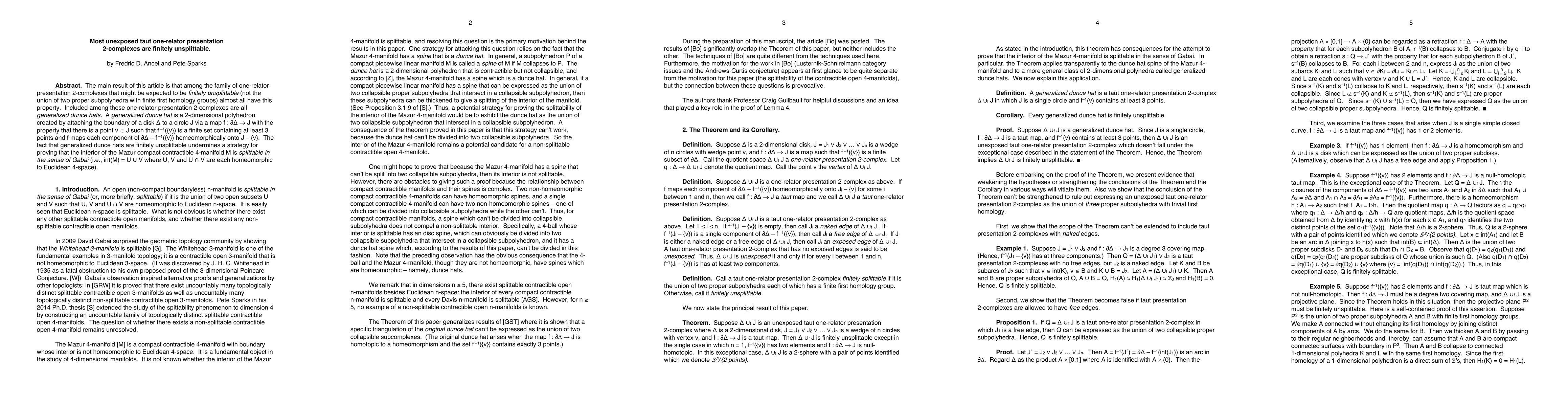 The main result of this article is that among the family of one-relator presentation 2-complexes that might be expected to be finitely unsplittable (not the union of two proper subpolyhedra with finite first homology groups) almost all have this property. Included among these one-relator presentation 2-complexes are all generalized dunce hats. A generalized dunce hat is a 2-dimensional polyhedron created by attaching the boundary of a disk $\Delta$ to a circle $J$ via a map $f : \partial\Delta \rightarrow J$ with the property that there is a point $v$ in $J$ such that $f^{-1}(\{v\})$ is a finite set containing at least 3 points and $f$ maps each component of $\partial\Delta - f^{-1}(\{v\})$ homeomorphically onto $J - \{v\}$. The fact that generalized dunce hats are finitely unsplittable undermines a strategy for proving that the interior of the Mazur compact contractible 4-manifold $M$ is splittable in the sense of Gabai (i.e., $\text{int}(M) = U \cup V$ where $U$, $V$ and $U \cap V$ are each homeomorphic to Euclidean 4-space).