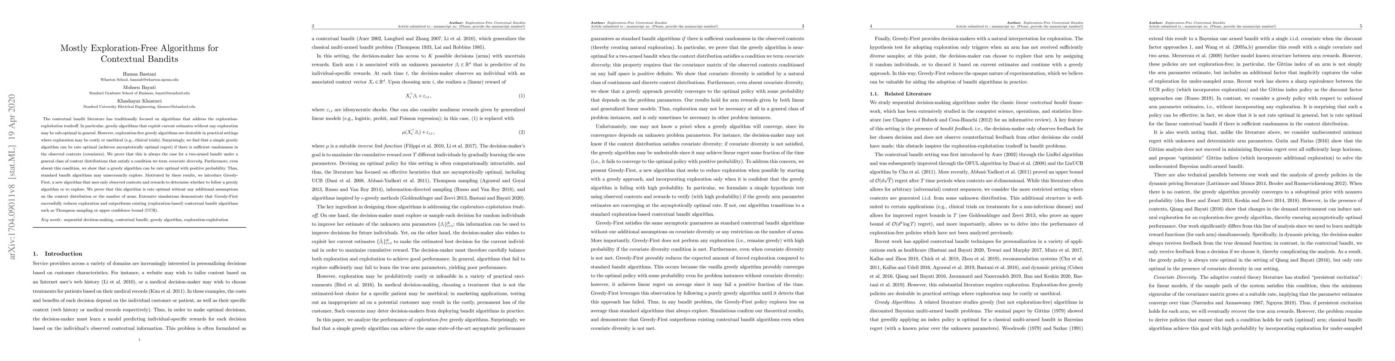 The contextual bandit literature has traditionally focused on algorithms that address the exploration-exploitation tradeoff. In particular, greedy algorithms that exploit current estimates without any exploration may be sub-optimal in general. However, exploration-free greedy algorithms are desirable in practical settings where exploration may be costly or unethical (e.g., clinical trials). Surprisingly, we find that a simple greedy algorithm can be rate optimal (achieves asymptotically optimal regret) if there is sufficient randomness in the observed contexts (covariates). We prove that this is always the case for a two-armed bandit under a general class of context distributions that satisfy a condition we term covariate diversity. Furthermore, even absent this condition, we show that a greedy algorithm can be rate optimal with positive probability. Thus, standard bandit algorithms may unnecessarily explore. Motivated by these results, we introduce Greedy-First, a new algorithm that uses only observed contexts and rewards to determine whether to follow a greedy algorithm or to explore. We prove that this algorithm is rate optimal without any additional assumptions on the context distribution or the number of arms. Extensive simulations demonstrate that Greedy-First successfully reduces exploration and outperforms existing (exploration-based) contextual bandit algorithms such as Thompson sampling or upper confidence bound (UCB).