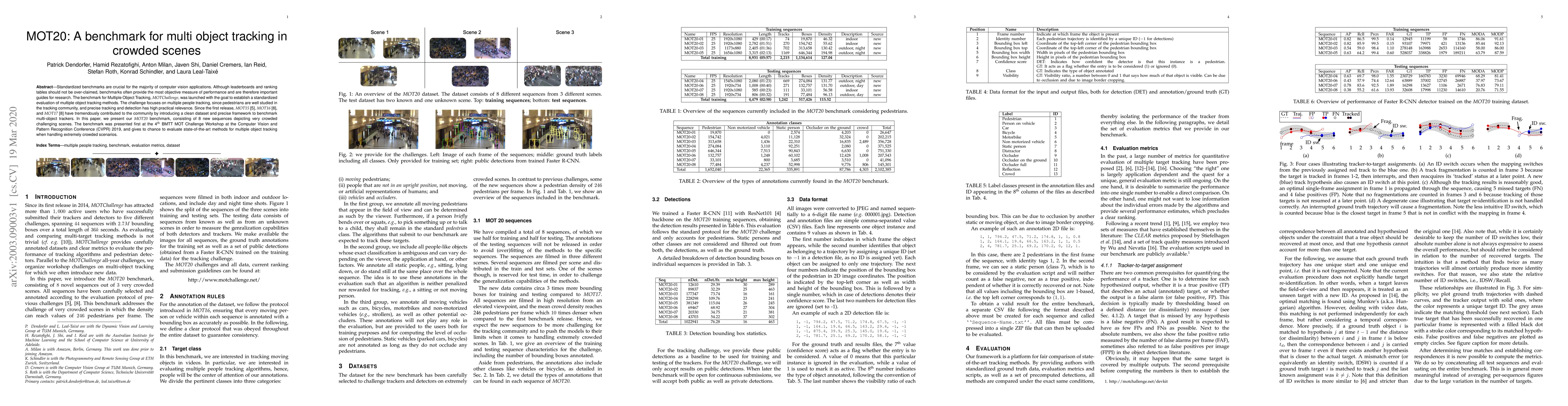 MOT20 introduces a new benchmark for evaluating multiple object tracking methods in extremely crowded scenes, providing 8 new challenging sequences to assess state-of-the-art performance in tracking precision amidst high-density environments. This benchmark builds on previous MOTChallenge releases, aiming to guide and advance research in this practical and relevant field.