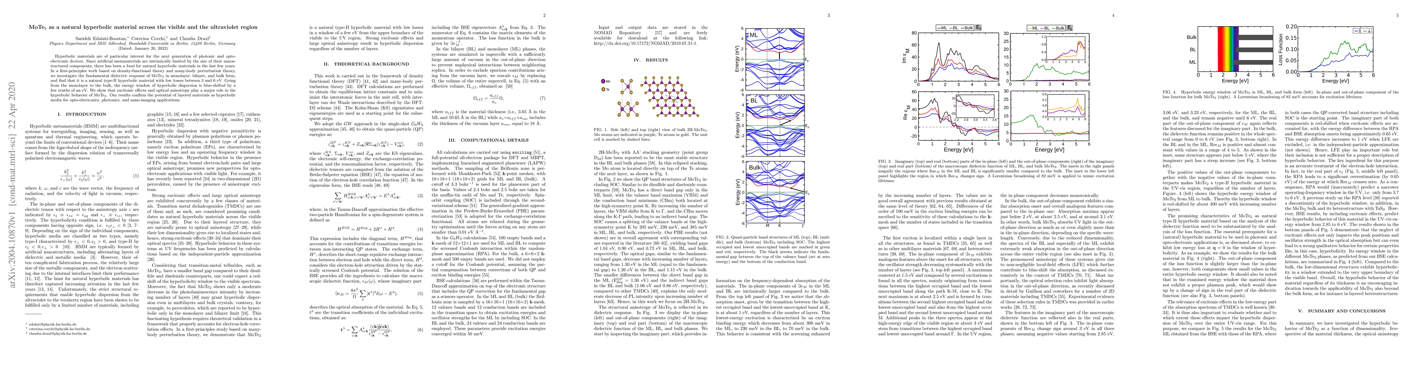 This paper investigates MoTe2 as a natural hyperbolic material across the visible and ultraviolet regions, revealing its type-II hyperbolic behavior with low losses. The study highlights the role of excitonic effects and optical anisotropy in its hyperbolic dispersion, confirming its potential for opto-electronics and photonics applications.