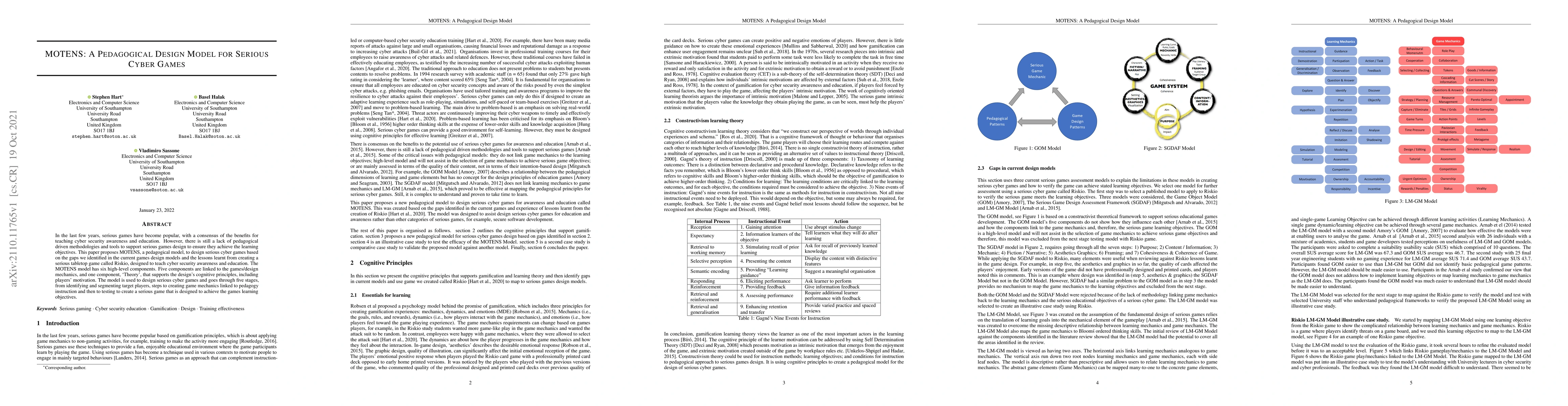 MOTENS is a pedagogical design model for creating serious cyber games aimed at enhancing cyber security awareness. It addresses the lack of structured methodologies for serious game design, incorporating six components to ensure alignment with learning objectives and player motivation.