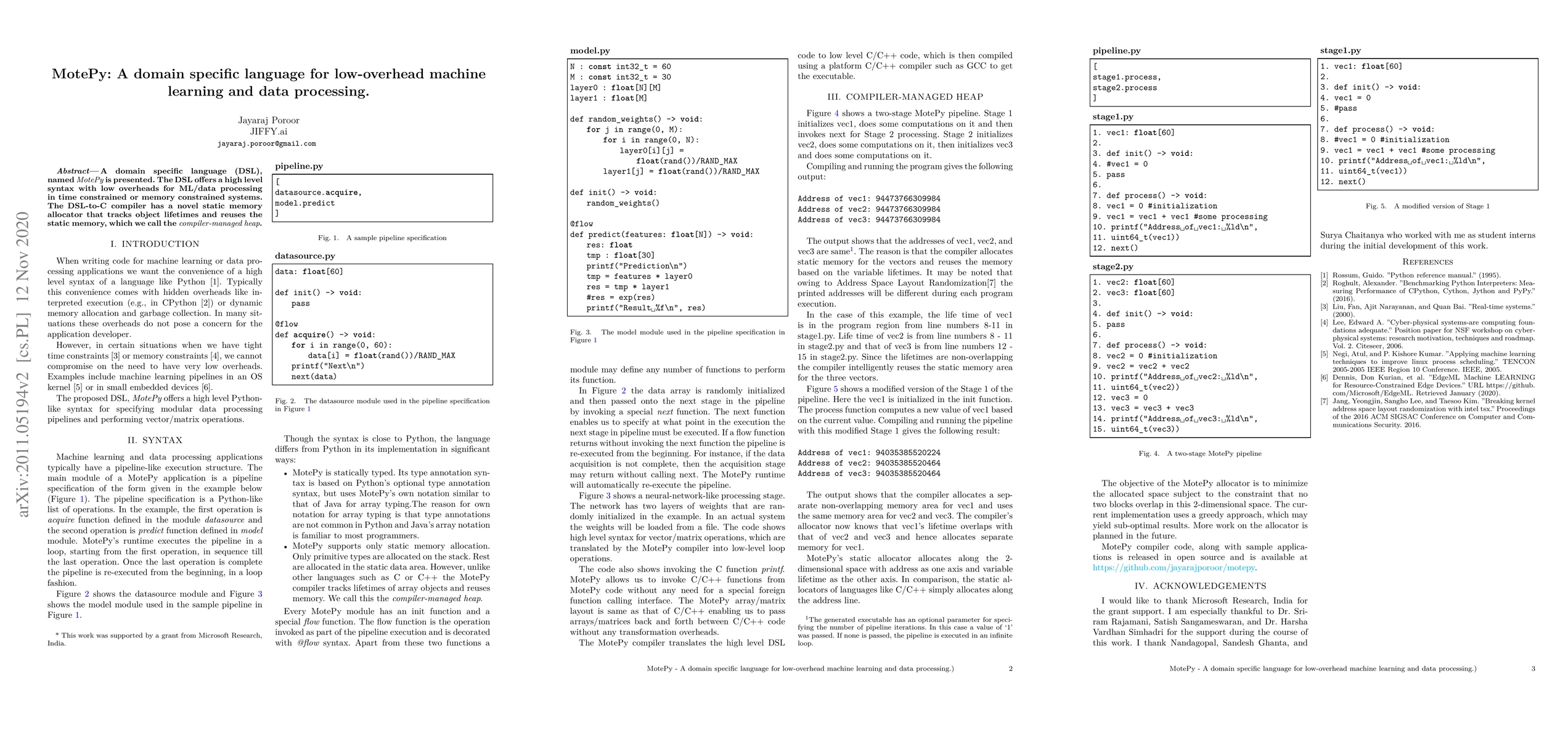 A domain specific language (DSL), named MotePy is presented. The DSL offers a high level syntax with low overheads for ML/data processing in time constrained or memory constrained systems. The DSL-to-C compiler has a novel static memory allocator that tracks object lifetimes and reuses the static memory, which we call the compiler-managed heap.