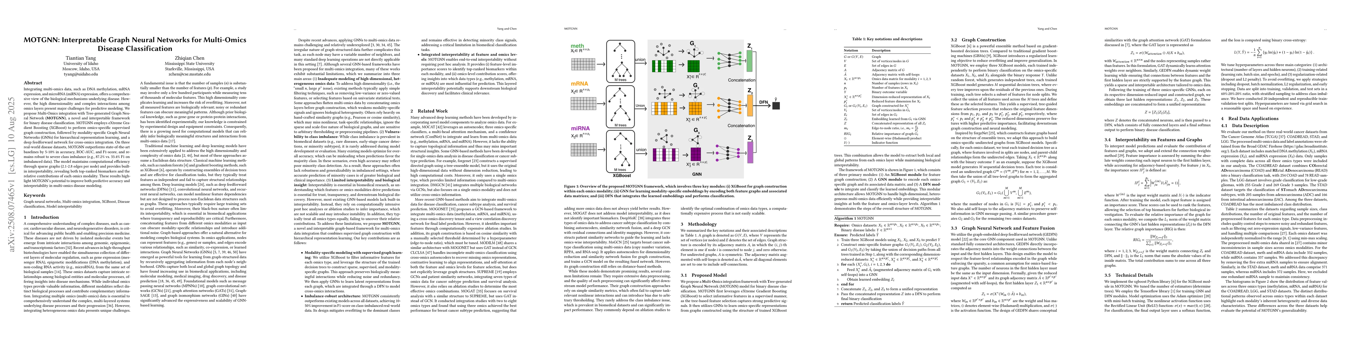 Integrating multi-omics data, such as DNA methylation, mRNA expression, and microRNA (miRNA) expression, offers a comprehensive view of the biological mechanisms underlying disease. However, the high dimensionality and complex interactions among omics layers present major challenges for predictive modeling. We propose Multi-Omics integration with Tree-generated Graph Neural Network (MOTGNN), a novel and interpretable framework for binary disease classification. MOTGNN employs eXtreme Gradient Boosting (XGBoost) to perform omics-specific supervised graph construction, followed by modality-specific Graph Neural Networks (GNNs) for hierarchical representation learning, and a deep feedforward network for cross-omics integration. On three real-world disease datasets, MOTGNN outperforms state-of-the-art baselines by 5-10% in accuracy, ROC-AUC, and F1-score, and remains robust to severe class imbalance (e.g., 87.2% vs. 33.4% F1 on imbalanced data). The model maintains computational efficiency through sparse graphs (2.1-2.8 edges per node) and provides built-in interpretability, revealing both top-ranked biomarkers and the relative contributions of each omics modality. These results highlight MOTGNN's potential to improve both predictive accuracy and interpretability in multi-omics disease modeling.