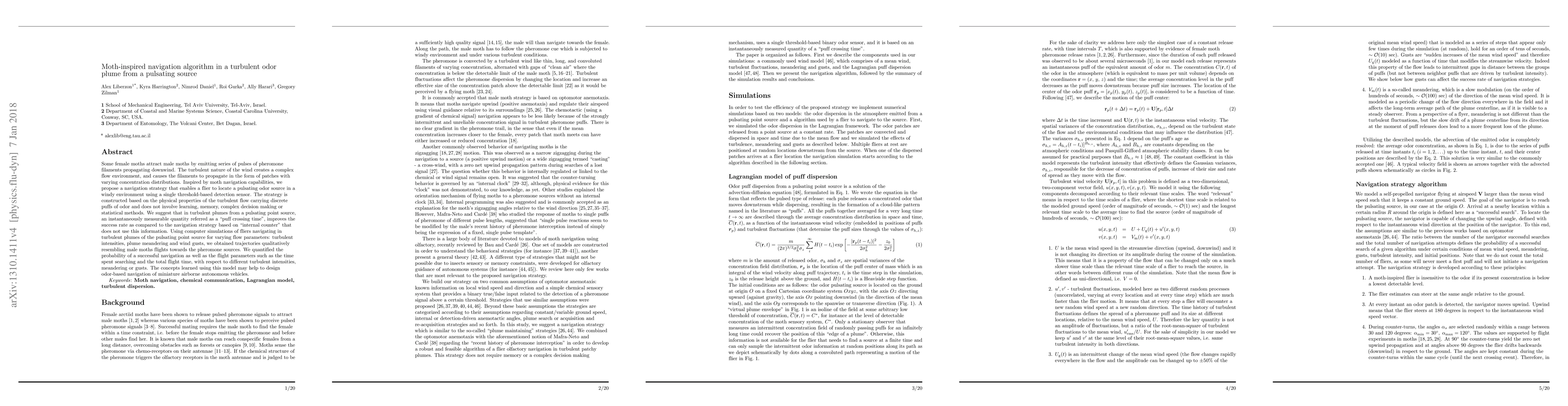 Researchers developed a navigation algorithm inspired by moth behavior to locate pulsating odor sources in turbulent environments using a single threshold-based detection sensor. Computer simulations showed successful trajectories resembling male moths' flights towards pheromone sources.