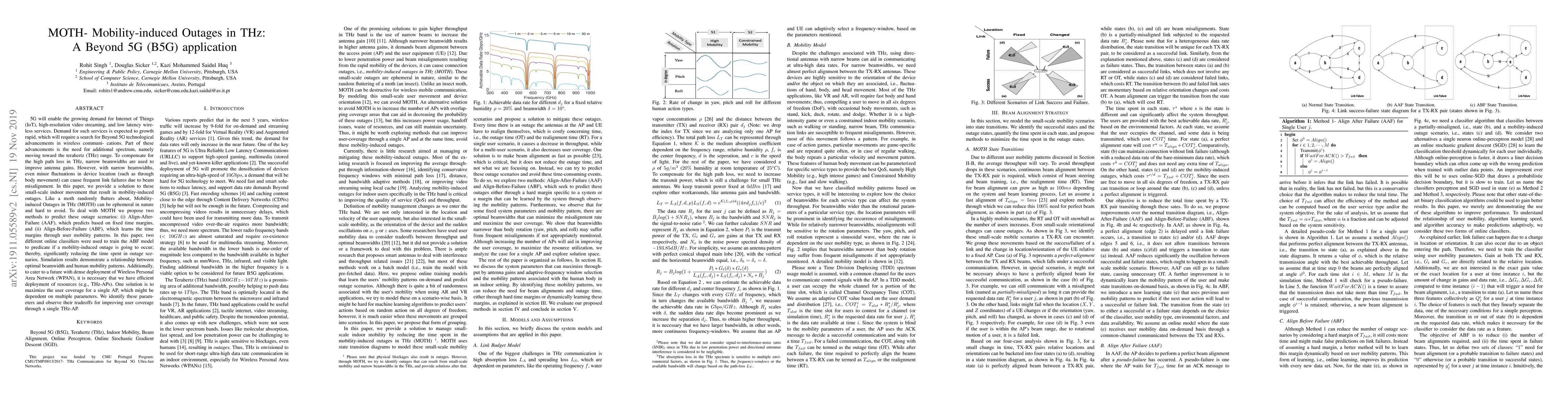 5G will enable the growing demand for Internet of Things (IoT), high-resolution video streaming, and low latency wireless services. Demand for such services is expected to growth rapid, which will require a search for Beyond 5G technological advancements in wireless communications. Part of these advancements is the need for additional spectrum, namely moving toward the terahertz (THz) range. To compensate for the high path loss in THz, narrow beamwidths are used to improve antenna gains. However, with narrow beamwidths, even minor fluctuations in device location (such as through body movement) can cause frequent link failures due to beam misalignment. In this paper, we provide a solution to these small-scale indoor movement that result in mobility-induced outages. Like a moth randomly flutters about, Mobility-induced Outages in THz (MOTH) can be ephemeral in nature and hard to avoid. To deal with MOTH we propose two methods to predict these outage scenarios: (i) Align-After-Failure (AAF), which predicts based on fixed time margins, and (ii) Align-Before-Failure (ABF), which learns the time margins through user mobility patterns. In this paper, two different online classifiers were used to train the ABF model to predicate if a mobility-induced outage is going to occur; thereby, significantly reducing the time spent in outage scenarios. Simulation results demonstrate a relationship between optimal beamwidth and human mobility patterns. Additionally, to cater to a future with dense deployment of Wireless Personal Area Network (WPAN), it is necessary that we have efficient deployment of resources (e.g., THz-APs). One solution is to maximize the user coverage for a single AP, which might be dependent on multiple parameters. We identify these parameters and observe their tradeoffs for improving user coverage through a single THz-AP.