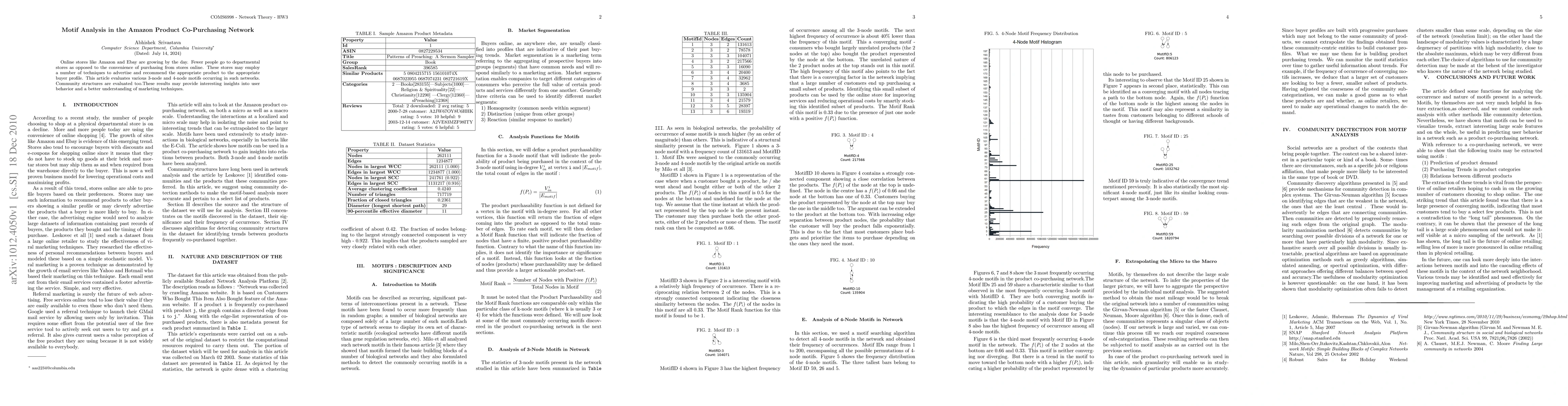 The paper analyzes Amazon's product co-purchasing network to identify key marketing techniques and user behavior patterns, including common motifs and community structures.