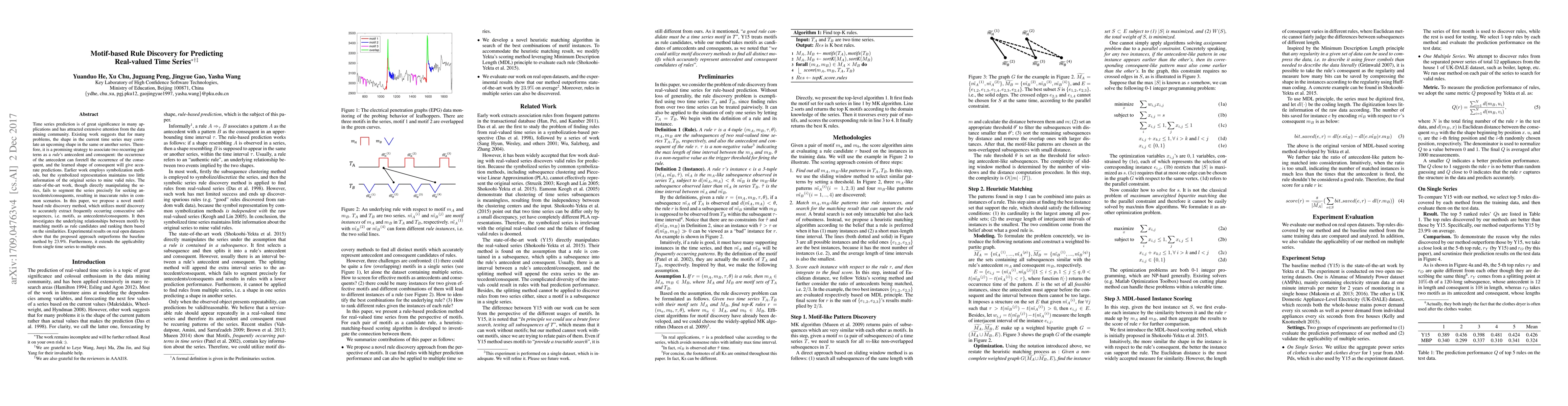 This paper introduces a motif-based rule discovery method for predicting real-valued time series, leveraging motif extraction to identify frequently occurring subsequences as antecedents and consequents, and demonstrates superior performance over baseline methods by 23.9% on real datasets. The approach enhances the precision of rule extraction compared to previous symbolization and direct manipulation methods.