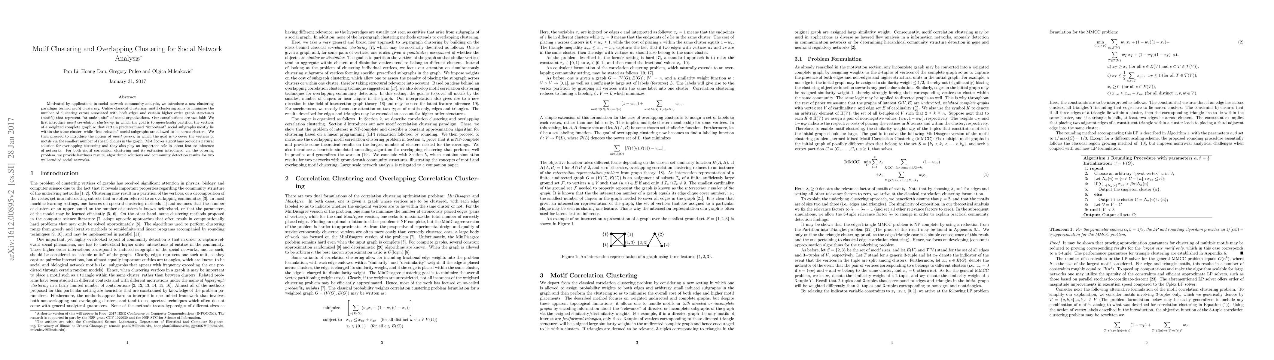 Motivated by applications in social network community analysis, we introduce a new clustering paradigm termed motif clustering. Unlike classical clustering, motif clustering aims to minimize the number of clustering errors associated with both edges and certain higher order graph structures (motifs) that represent "atomic units" of social organizations. Our contributions are two-fold: We first introduce motif correlation clustering, in which the goal is to agnostically partition the vertices of a weighted complete graph so that certain predetermined "important" social subgraphs mostly lie within the same cluster, while "less relevant" social subgraphs are allowed to lie across clusters. We then proceed to introduce the notion of motif covers, in which the goal is to cover the vertices of motifs via the smallest number of (near) cliques in the graph. Motif cover algorithms provide a natural solution for overlapping clustering and they also play an important role in latent feature inference of networks. For both motif correlation clustering and its extension introduced via the covering problem, we provide hardness results, algorithmic solutions and community detection results for two well-studied social networks.