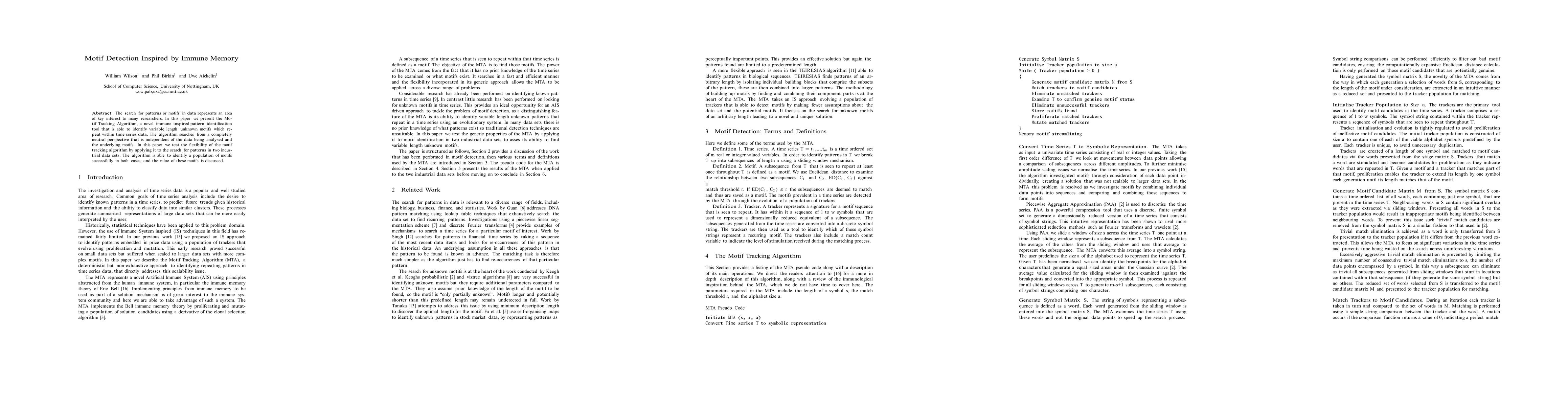 The search for patterns or motifs in data represents an area of key interest to many researchers. In this paper we present the Motif Tracking Algorithm, a novel immune inspired pattern identification tool that is able to identify variable length unknown motifs which repeat within time series data. The algorithm searches from a completely neutral perspective that is independent of the data being analysed and the underlying motifs. In this paper we test the flexibility of the motif tracking algorithm by applying it to the search for patterns in two industrial data sets. The algorithm is able to identify a population of motifs successfully in both cases, and the value of these motifs is discussed.
