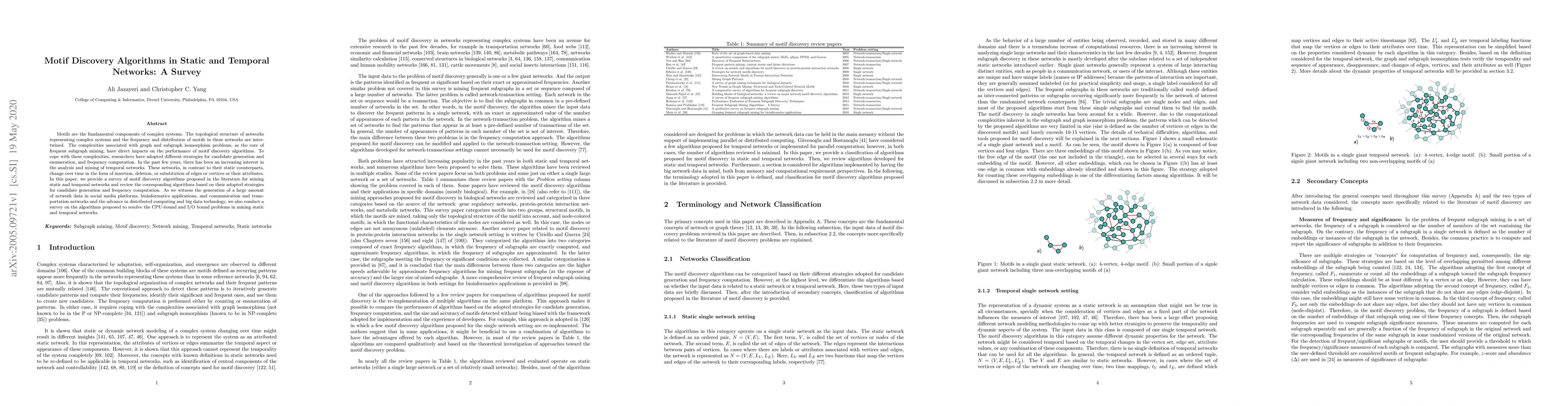 This paper surveys motif discovery algorithms for static and temporal networks, focusing on strategies for candidate generation and frequency computation. It also reviews algorithms addressing computational challenges in mining large network datasets.
