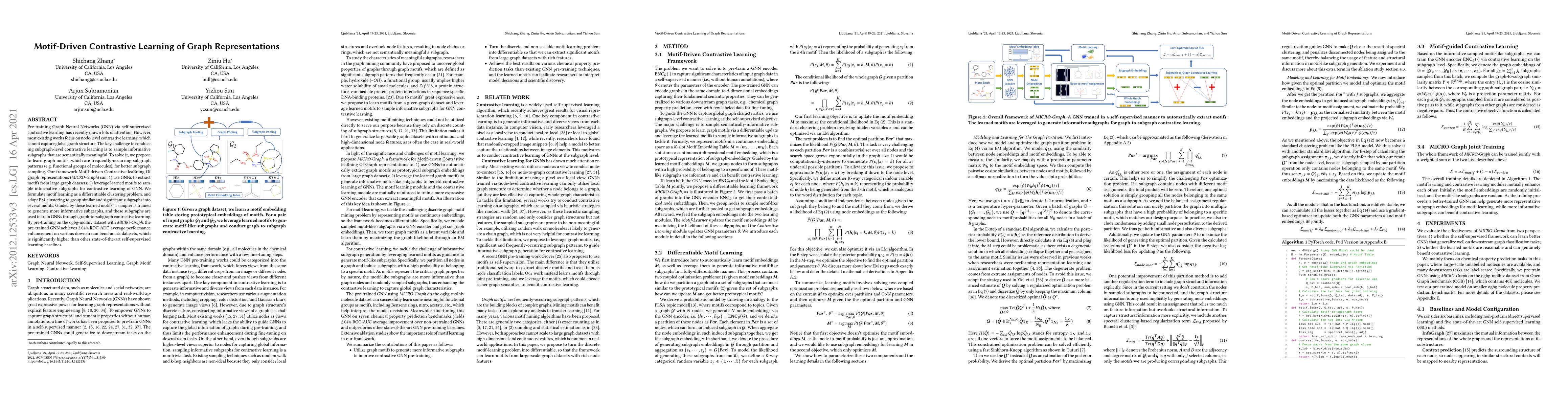 This paper proposes MICRO-Graph, a motif-driven contrastive learning framework for Graph Neural Networks (GNNs) that enhances global graph structure representation. It uses GNNs to extract and learn graph motifs for better subgraph sampling, leading to improved performance on downstream tasks by 2.04% ROC-AUC on average compared to other self-supervised learning methods.