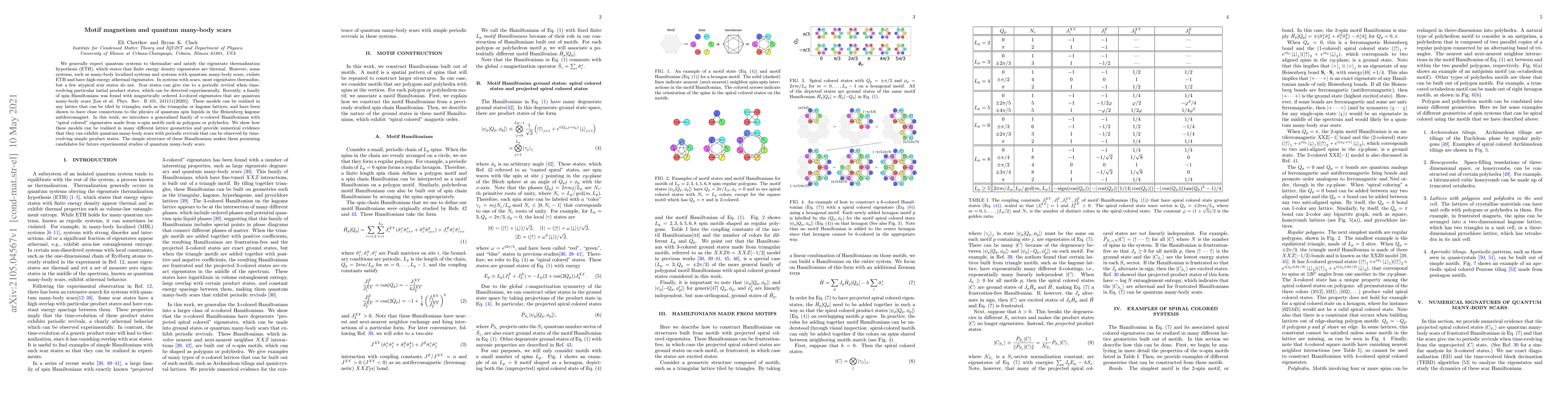 We generally expect quantum systems to thermalize and satisfy the eigenstate thermalization hypothesis (ETH), which states that finite energy density eigenstates are thermal. However, some systems, such as many-body localized systems and systems with quantum many-body scars, violate ETH and have high-energy athermal eigenstates. In systems with scars, most eigenstates thermalize, but a few atypical scar states do not. Scar states can give rise to a periodic revival when time-evolving particular initial product states, which can be detected experimentally. Recently, a family of spin Hamiltonians was found with magnetically ordered 3-colored eigenstates that are quantum many-body scars [Lee et al. Phys. Rev. B 101, 241111(2020)]. These models can be realized in any lattice that can be tiled by triangles, such as the triangular or kagome lattices, and have been shown to have close connections to the physics of quantum spin liquids in the Heisenberg kagome antiferromagnet. In this work, we introduce a generalized family of $n$-colored Hamiltonians with "spiral colored" eigenstates made from $n$-spin motifs such as polygons or polyhedra. We show how these models can be realized in many different lattice geometries and provide numerical evidence that they can exhibit quantum many-body scars with periodic revivals that can be observed by time-evolving simple product states. The simple structure of these Hamiltonians makes them promising candidates for future experimental studies of quantum many-body scars.