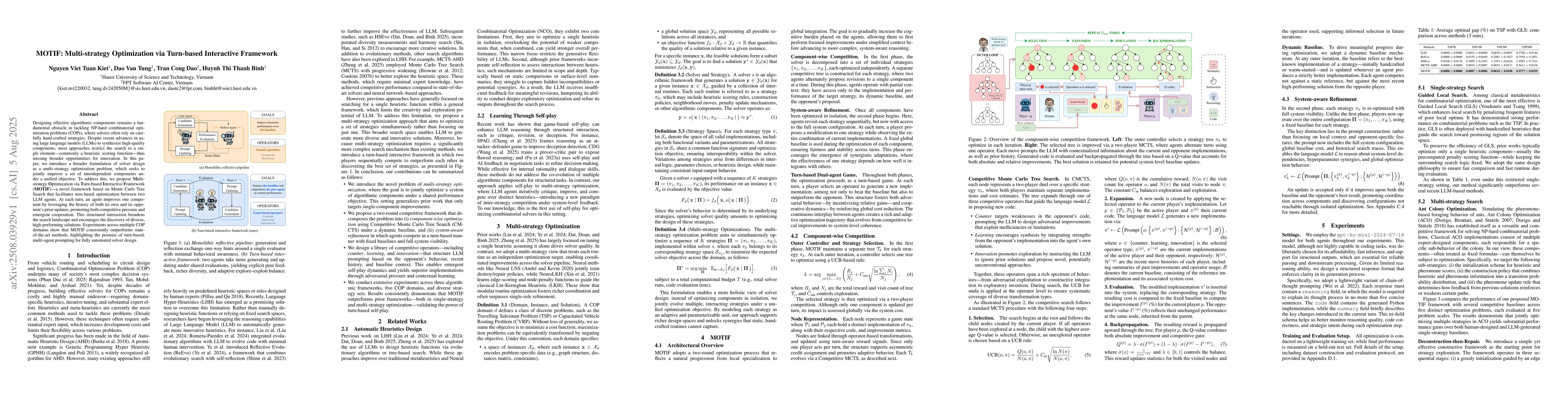 Designing effective algorithmic components remains a fundamental obstacle in tackling NP-hard combinatorial optimization problems (COPs), where solvers often rely on carefully hand-crafted strategies. Despite recent advances in using large language models (LLMs) to synthesize high-quality components, most approaches restrict the search to a single element - commonly a heuristic scoring function - thus missing broader opportunities for innovation. In this paper, we introduce a broader formulation of solver design as a multi-strategy optimization problem, which seeks to jointly improve a set of interdependent components under a unified objective. To address this, we propose Multi-strategy Optimization via Turn-based Interactive Framework (MOTIF) - a novel framework based on Monte Carlo Tree Search that facilitates turn-based optimization between two LLM agents. At each turn, an agent improves one component by leveraging the history of both its own and its opponent's prior updates, promoting both competitive pressure and emergent cooperation. This structured interaction broadens the search landscape and encourages the discovery of diverse, high-performing solutions. Experiments across multiple COP domains show that MOTIF consistently outperforms state-of-the-art methods, highlighting the promise of turn-based, multi-agent prompting for fully automated solver design.