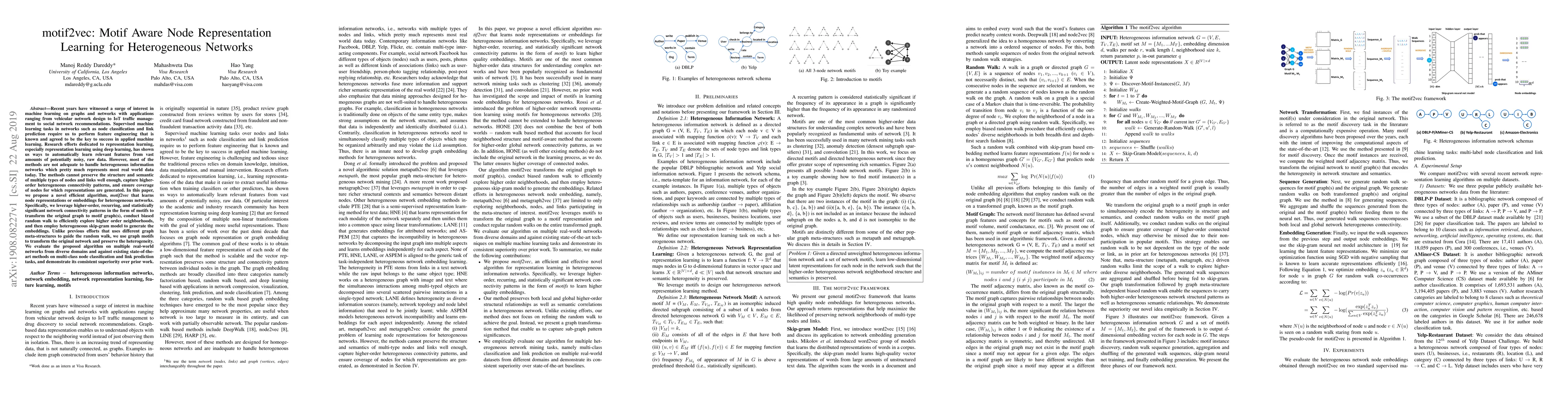 Motif2vec is a novel algorithm for learning node representations in heterogeneous networks by leveraging significant network motifs. It outperforms existing methods in multi-class node classification and link prediction tasks by preserving network heterogeneity and higher-order connectivity patterns.