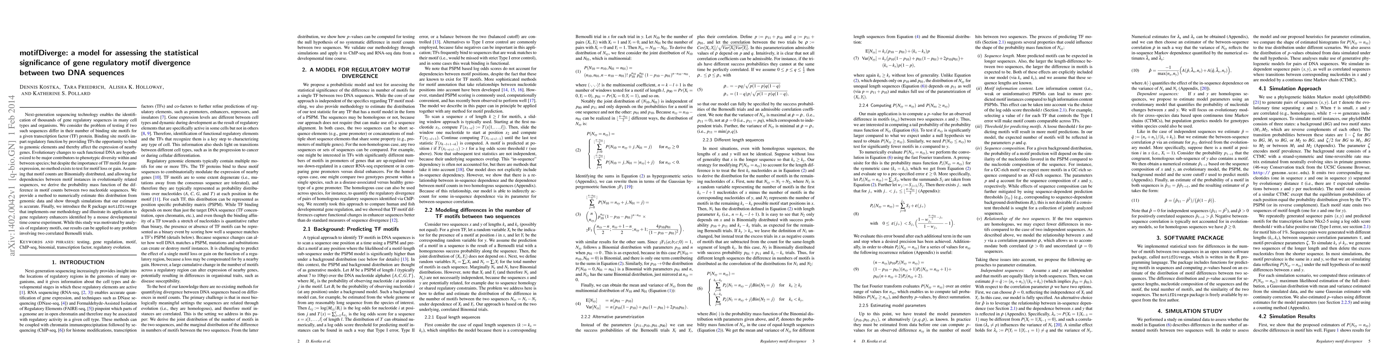 The paper introduces motifDiverge, a statistical model to assess the significance of gene regulatory motif divergence between two DNA sequences, addressing the lack of existing methods for testing motif loss or gain. The authors derive a probability mass function for motif count differences and provide an R package for its implementation, demonstrating its application to mouse developmental enhancers.