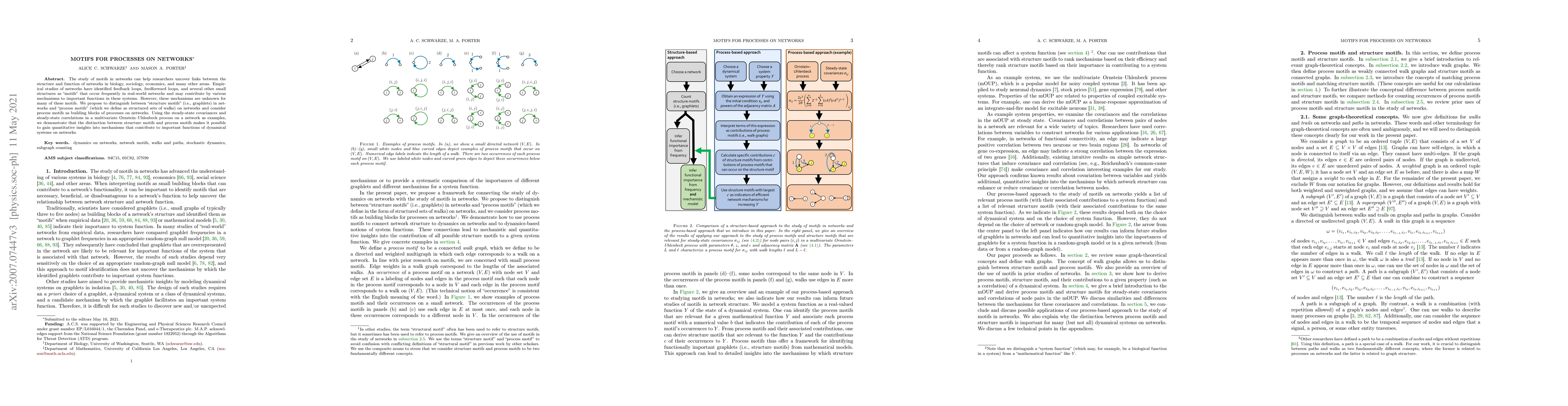 This paper distinguishes between "structure motifs" (graphlets) and "process motifs" (structured sets of walks) in networks to better understand their roles in network functions. It demonstrates that analyzing process motifs can provide quantitative insights into the mechanisms underlying dynamic processes on networks.