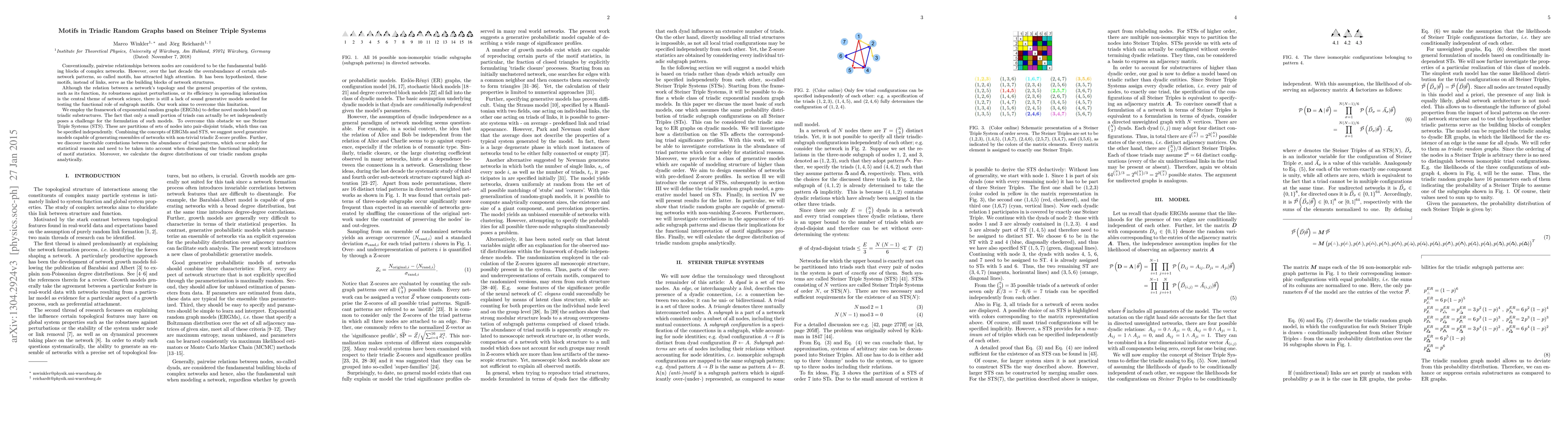 This paper proposes novel generative models based on Steiner Triple Systems within exponential random graph frameworks to explore triadic motifs in complex networks, addressing the challenge of independent triad specification and revealing inherent correlations between triad patterns that influence motif statistics and network properties. Analytical calculations provide insights into the degree distributions of the generated triadic random graphs.