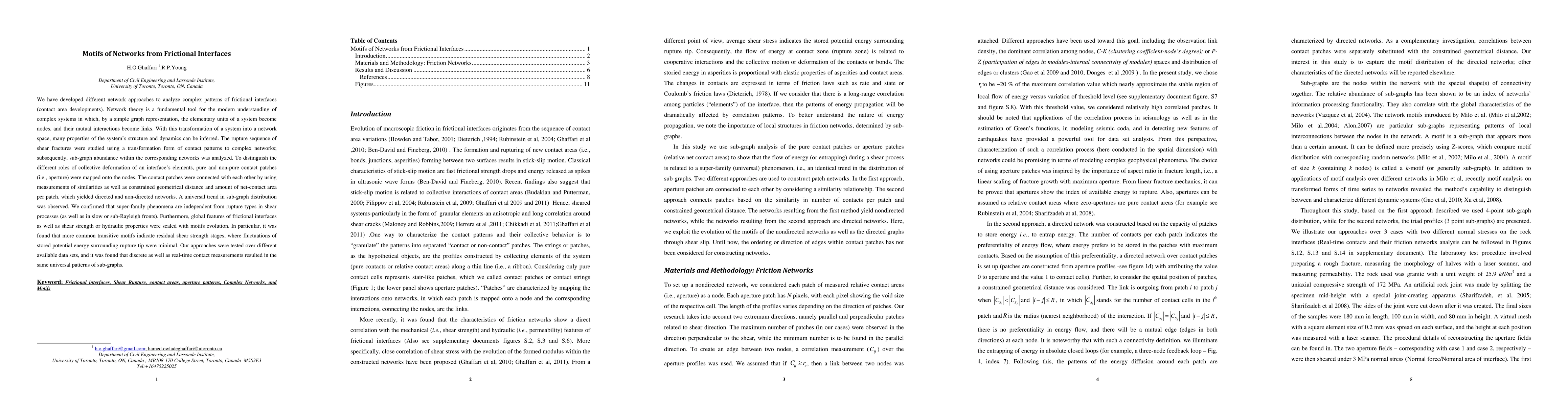 This paper develops network approaches to analyze the complex patterns of frictional interfaces, transforming contact area developments into network graphs to study shear fracture rupture sequences. The study reveals universal trends in sub-graph distribution and confirms that super-family phenomena are independent of rupture types, while common transitive motifs correlate with minimal fluctuations in stored potential energy during residual shear strength stages.