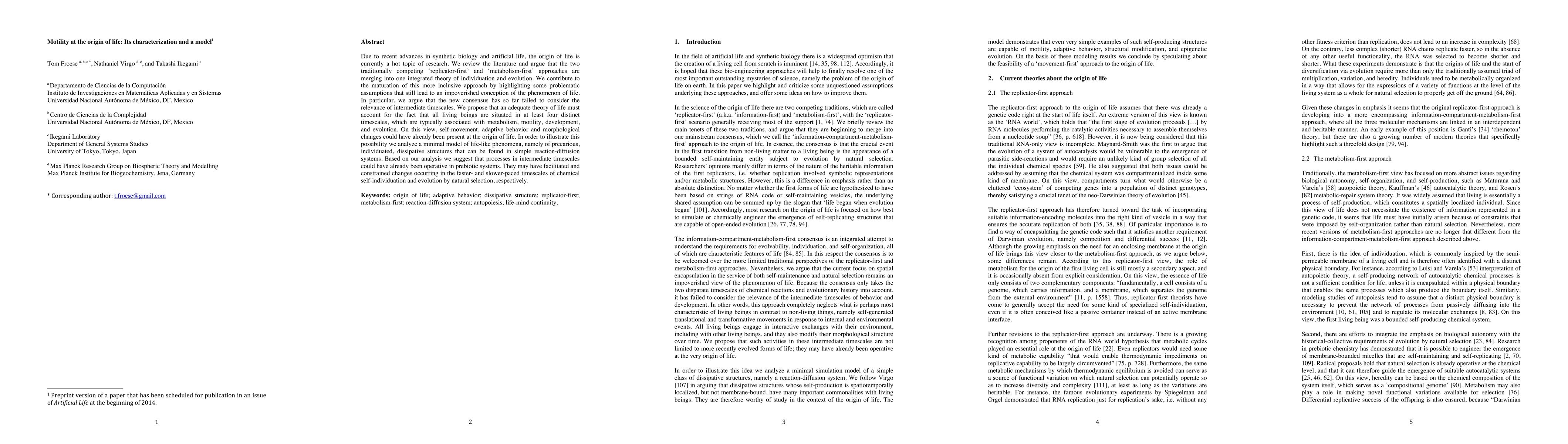 Due to recent advances in synthetic biology and artificial life, the origin of life is currently a hot topic of research. We review the literature and argue that the two traditionally competing "replicator-first" and "metabolism-first" approaches are merging into one integrated theory of individuation and evolution. We contribute to the maturation of this more inclusive approach by highlighting some problematic assumptions that still lead to an impoverished conception of the phenomenon of life. In particular, we argue that the new consensus has so far failed to consider the relevance of intermediate timescales. We propose that an adequate theory of life must account for the fact that all living beings are situated in at least four distinct timescales, which are typically associated with metabolism, motility, development, and evolution. On this view, self-movement, adaptive behavior and morphological changes could have already been present at the origin of life. In order to illustrate this possibility we analyze a minimal model of life-like phenomena, namely of precarious, individuated, dissipative structures that can be found in simple reaction-diffusion systems. Based on our analysis we suggest that processes in intermediate timescales could have already been operative in prebiotic systems. They may have facilitated and constrained changes occurring in the faster- and slower-paced timescales of chemical self-individuation and evolution by natural selection, respectively.