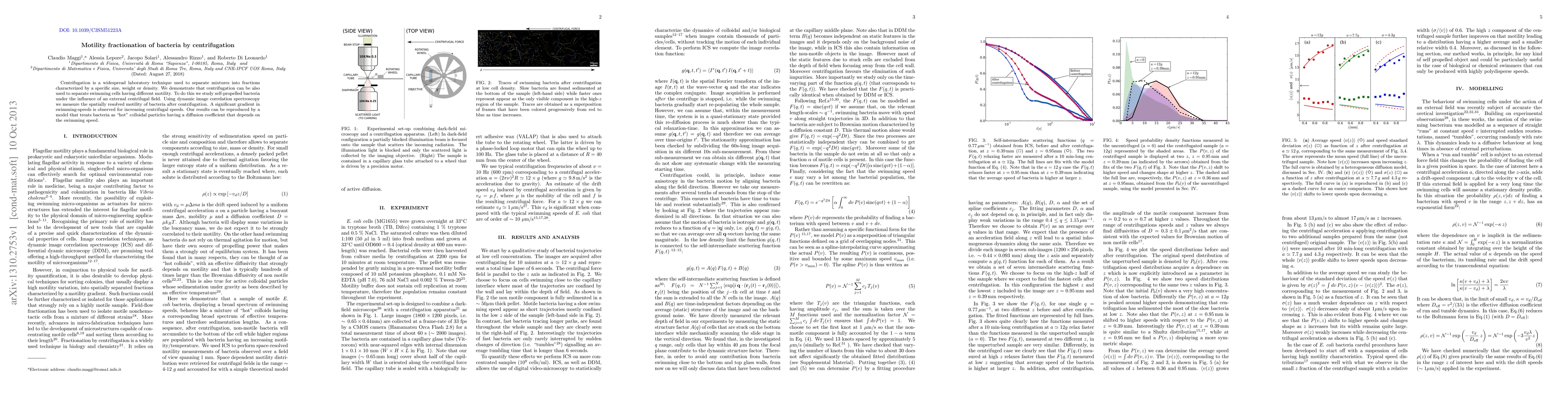 This paper demonstrates that centrifugation can separate bacteria based on their motility, revealing a gradient in swimming speeds under varying centrifugal forces. The findings are supported by a model treating bacteria as "hot" colloidal particles with a diffusion coefficient dependent on swimming speed.