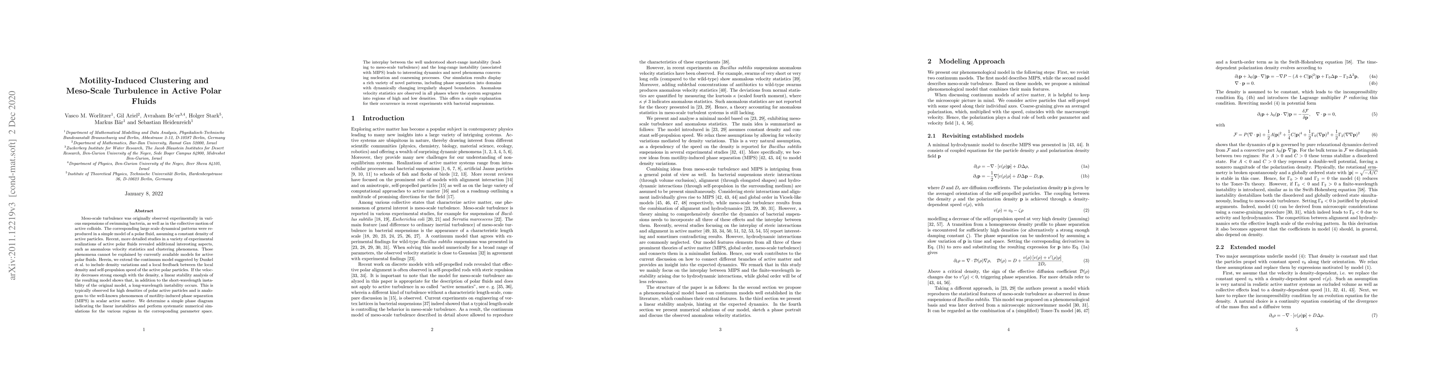 The extension of Dunkel et al.'s continuum model to incorporate density variations and feedback between local density and self-propulsion speed, along with a linear stability analysis and numerical simulations, provides a framework for understanding complex dynamics in active polar fluids.