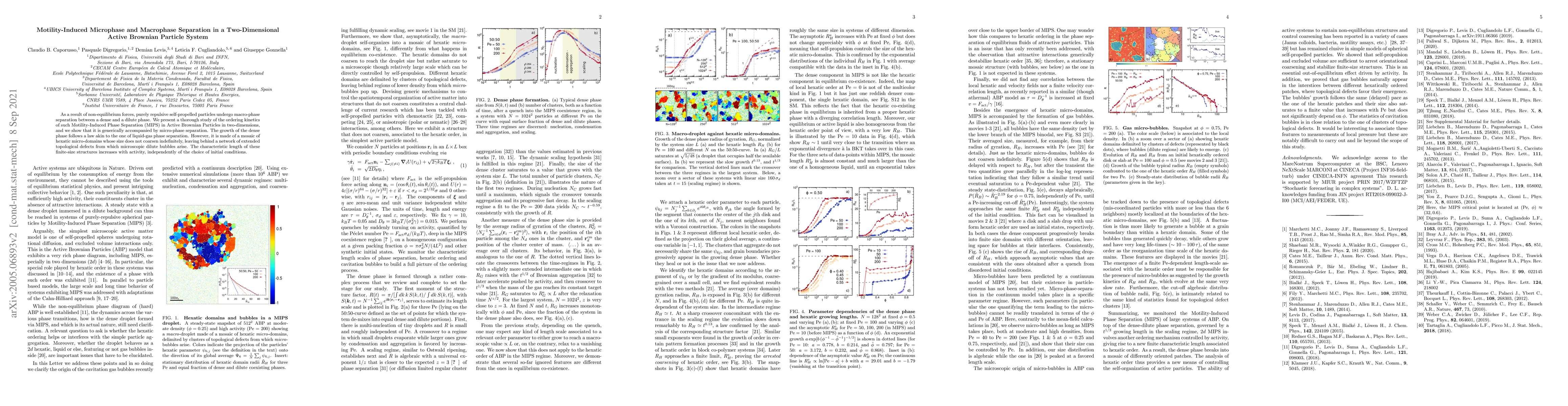 This paper investigates the motility-induced phase separation in a two-dimensional system of active Brownian particles, revealing that it leads to both macrophase and microphase separation. The dense phase grows according to a liquid-gas phase separation law but consists of hexatic microdomains with a finite size, resulting in a network of topological defects.