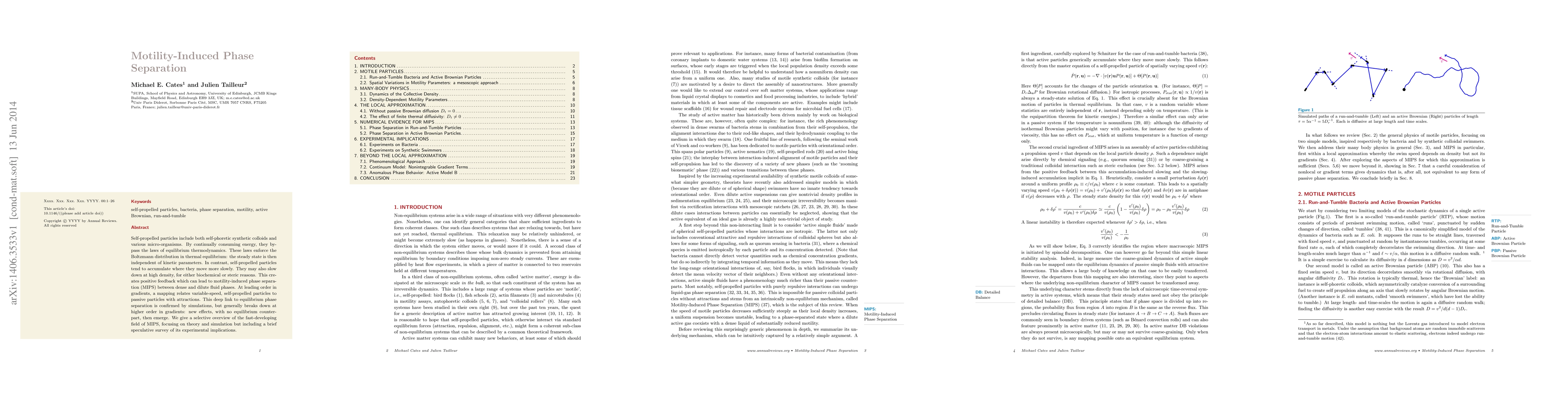 This paper explores motility-induced phase separation (MIPS) in self-propelled particles, demonstrating how non-equilibrium dynamics can lead to phase separation akin to equilibrium phase separation, though with unique effects. It highlights theoretical and simulation findings, and briefly discusses potential experimental implications.