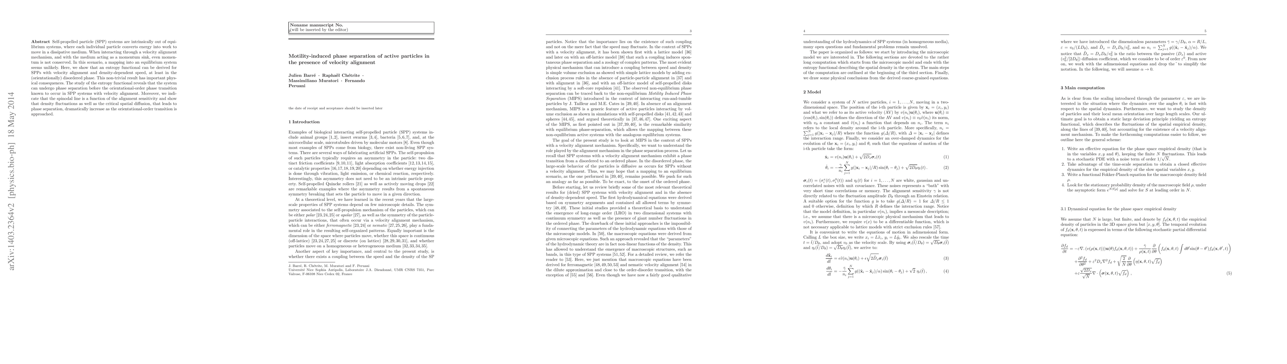 This paper investigates the motility-induced phase separation in self-propelled particle systems with velocity alignment, revealing an entropy functional applicable to disordered phases. The study finds that the system can undergo phase separation before the orientational-order phase transition, with density fluctuations and critical spatial diffusion increasing as the transition is approached.
