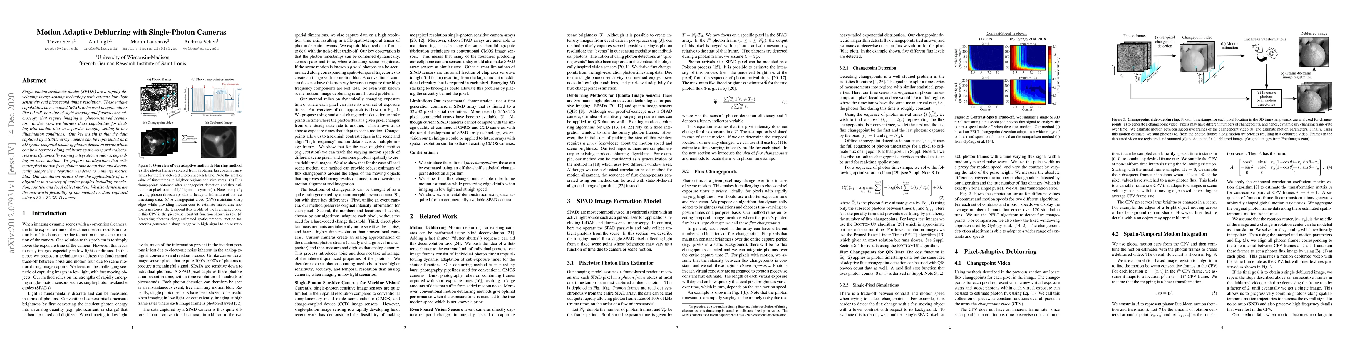 The research proposes an algorithm for motion adaptive deblurring using single-photon avalanche diode (SPAD) array cameras, representing captured data as a 3D spatio-temporal tensor. The algorithm estimates pixel motion from photon timestamp data and dynamically adapts integration windows to minimize motion blur.