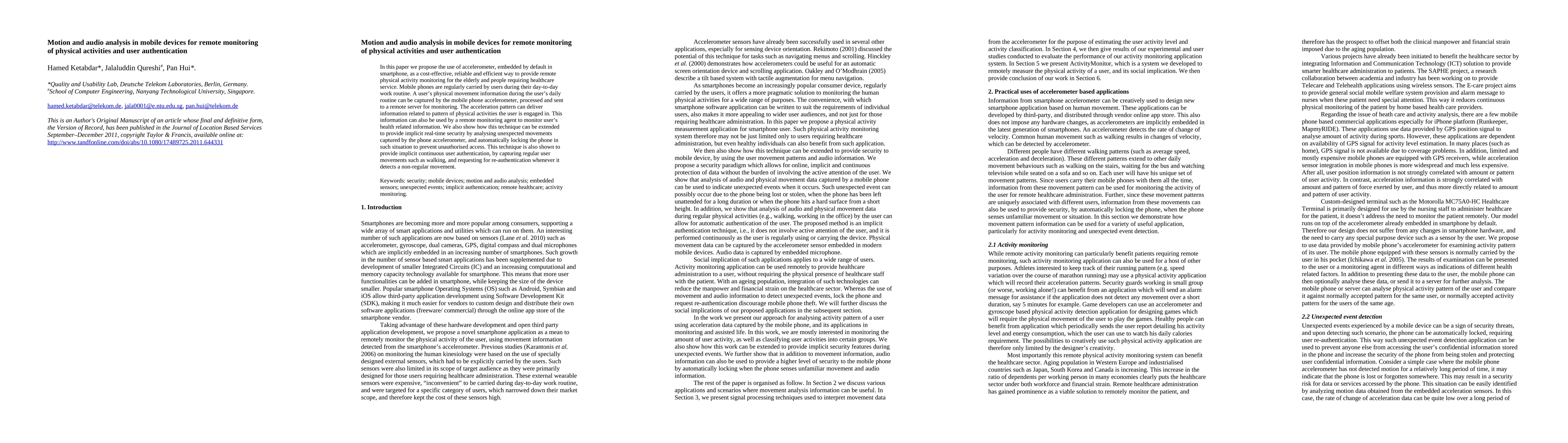 This paper proposes using smartphone accelerometers for remote monitoring of physical activities in elderly and healthcare users, leveraging the device's constant presence. It also extends this technique to provide implicit real-time security and continuous user authentication through unexpected and regular movement analysis.