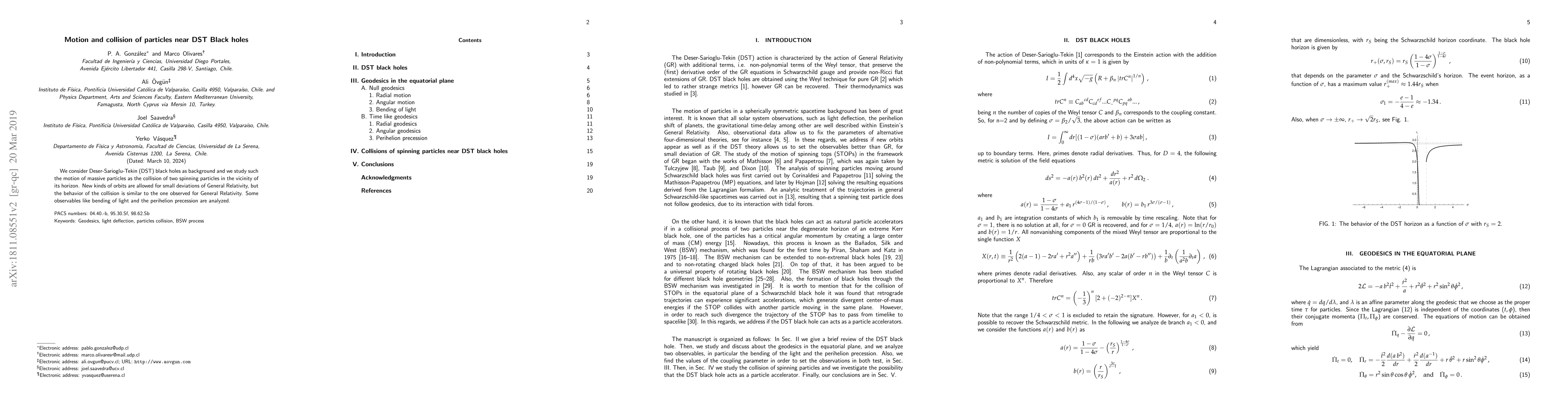 We consider Deser-Sarioglu-Tekin (DST) black holes as background and we study such the motion of massive particles as the collision of two spinning particles in the vicinity of its horizon. New kinds of orbits are allowed for small deviations of General Relativity, but the behavior of the collision is similar to the one observed for General Relativity. Some observables like bending of light and the perihelion precession are analyzed.