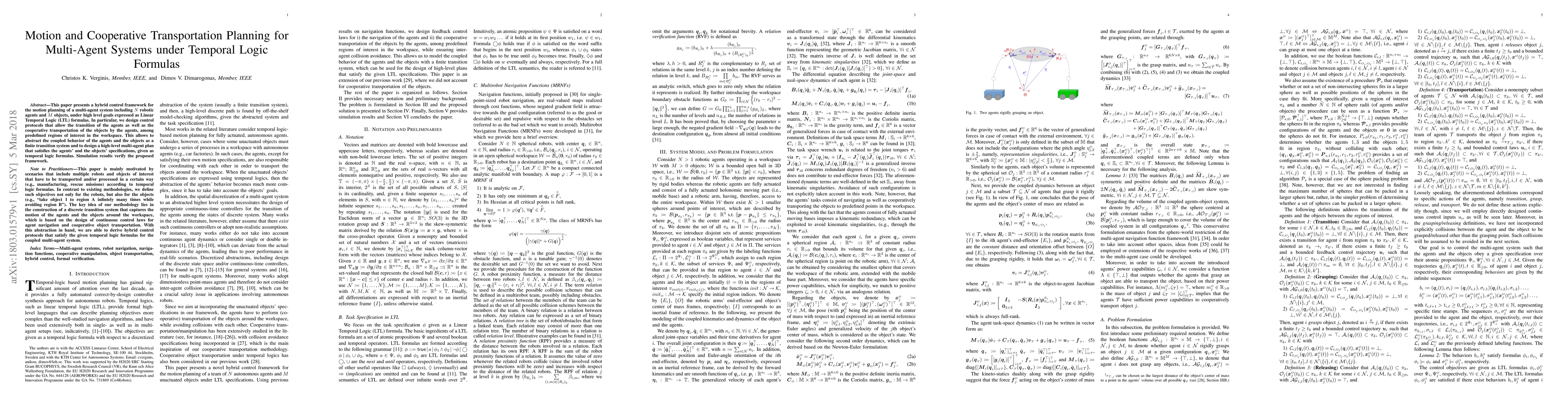 This paper presents a hybrid control framework for the motion planning of a multi-agent system including N robotic agents and M objects, under high level goals expressed as Linear Temporal Logic (LTL) formulas. In particular, we design control protocols that allow the transition of the agents as well as the cooperative transportation of the objects by the agents, among predefined regions of interest in the workspace. This allows to abstract the coupled behavior of the agents and the objects as a finite transition system and to design a high-level multi-agent plan that satisfies the agents' and the objects' specifications, given as temporal logic formulas. Simulation results verify the proposed framework.