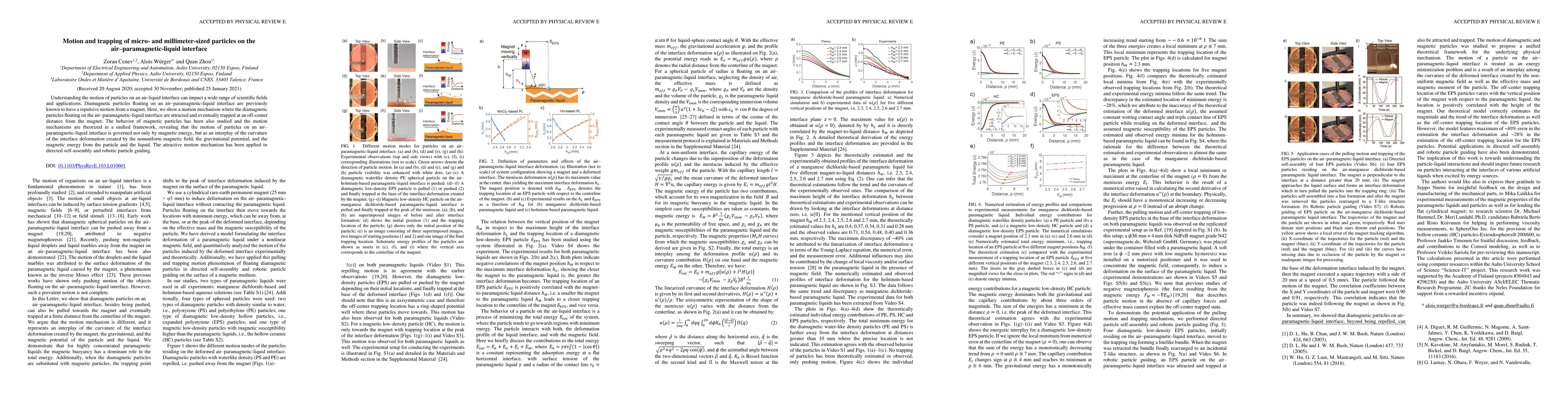 This paper explores the motion and trapping of micro- and millimeter-sized particles on an air-paramagnetic-liquid interface, demonstrating that diamagnetic particles can be attracted and trapped by a magnet. The study reveals a complex interplay of magnetic energy, interface deformation, and gravitational potential governing particle behavior, with applications in directed self-assembly and robotic particle manipulation.