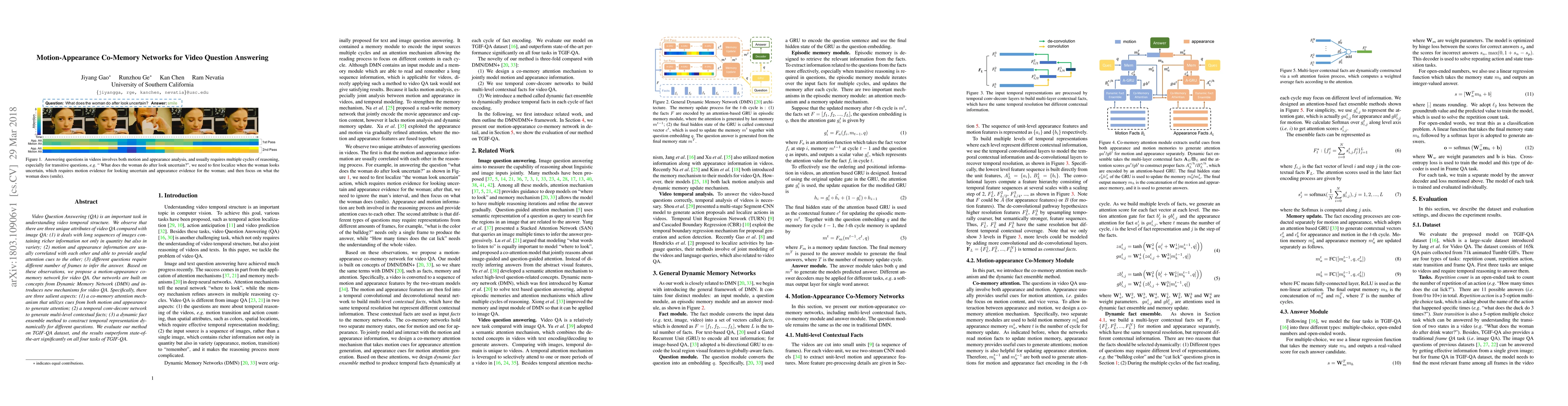 This paper proposes a motion-appearance co-memory network for video Question Answering, leveraging co-memory attention, temporal conv-deconv networks, and dynamic fact ensemble methods to outperform state-of-the-art on the TGIF-QA dataset. The approach addresses the unique challenges of video QA by integrating motion and appearance information.