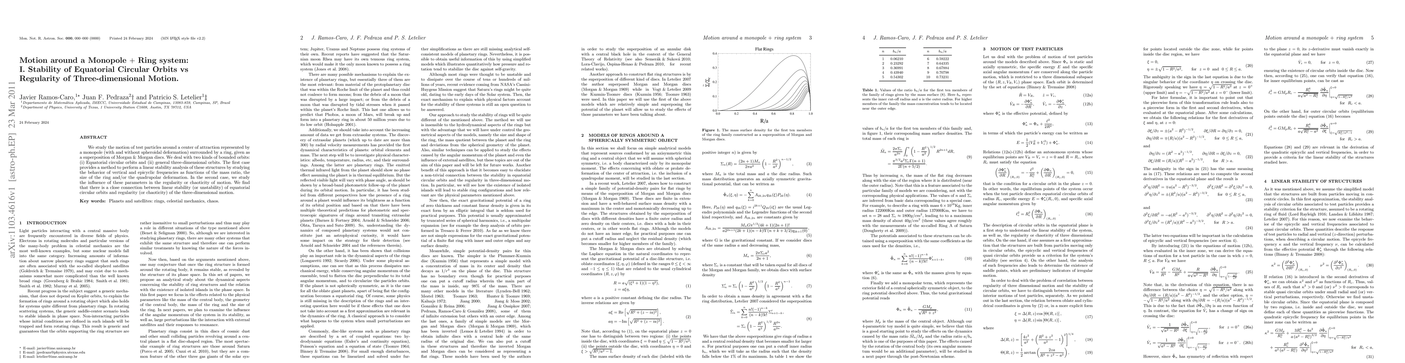 This paper investigates the stability of equatorial circular orbits and the regularity of three-dimensional motion around a monopole with a surrounding ring. It finds a strong correlation between the stability of circular orbits and the chaoticity or regularity of the three-dimensional motion.