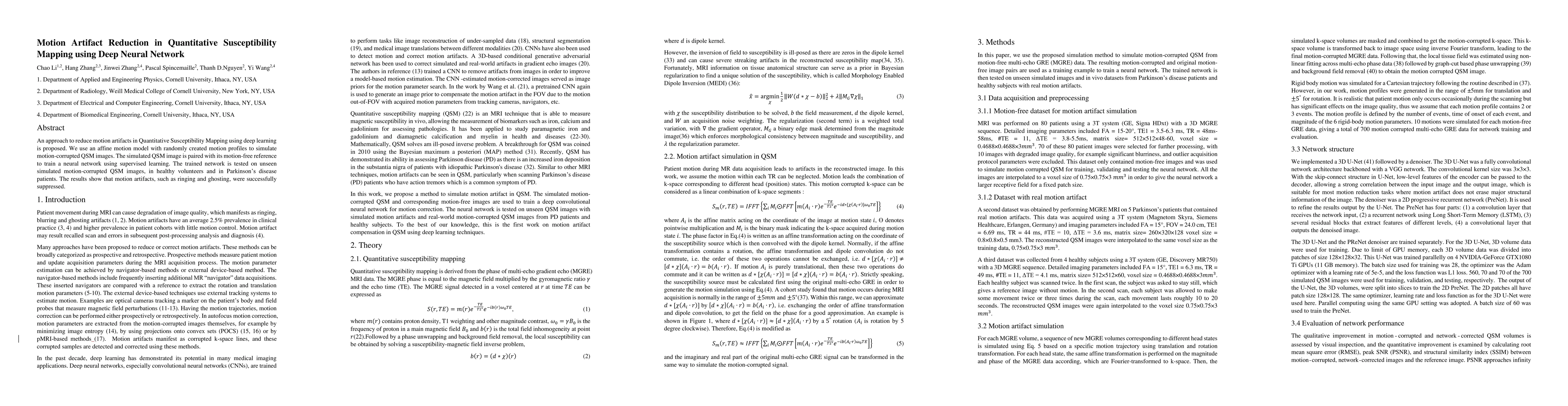 This paper proposes a deep neural network to reduce motion artifacts in Quantitative Susceptibility Mapping (QSM) using supervised learning with simulated motion-corrupted images. The trained network effectively suppresses artifacts in both simulated and real-world QSM images from healthy volunteers and Parkinson's disease patients.