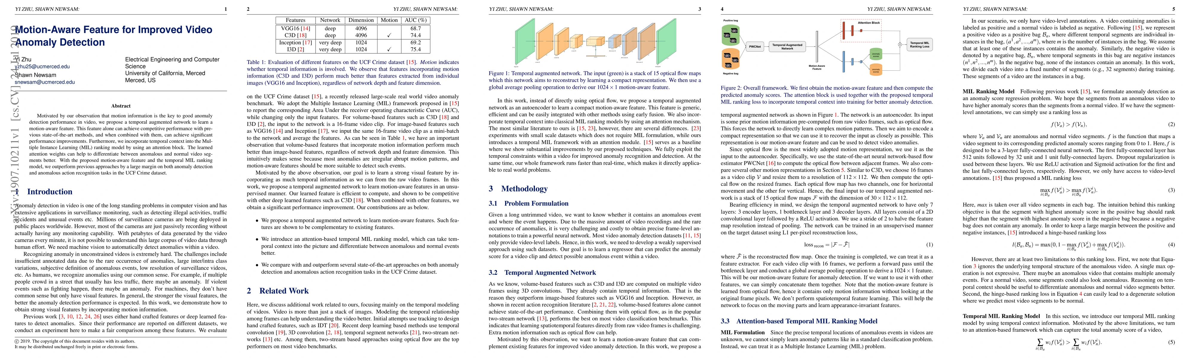 Motivated by our observation that motion information is the key to good anomaly detection performance in video, we propose a temporal augmented network to learn a motion-aware feature. This feature alone can achieve competitive performance with previous state-of-the-art methods, and when combined with them, can achieve significant performance improvements. Furthermore, we incorporate temporal context into the Multiple Instance Learning (MIL) ranking model by using an attention block. The learned attention weights can help to differentiate between anomalous and normal video segments better. With the proposed motion-aware feature and the temporal MIL ranking model, we outperform previous approaches by a large margin on both anomaly detection and anomalous action recognition tasks in the UCF Crime dataset.