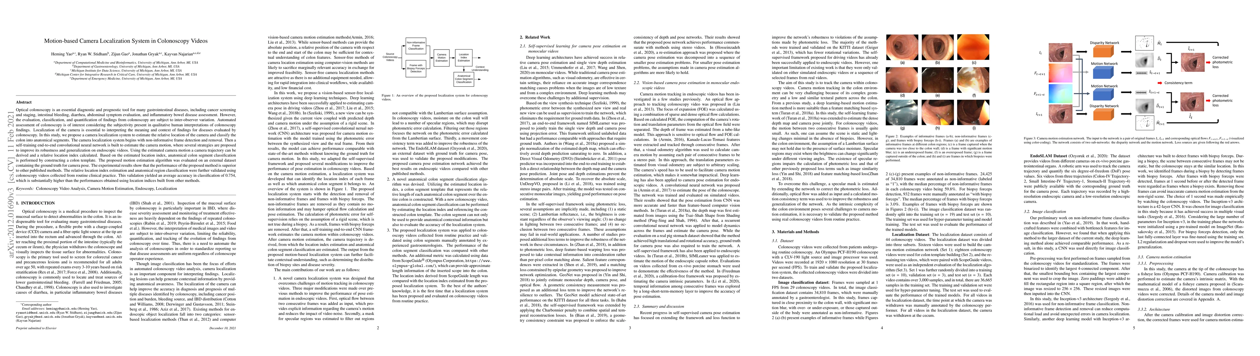 This study proposes a motion-based camera localization system for colonoscopy videos, utilizing a self-training convolutional neural network to estimate camera motion and classify colon segments. The method shows superior performance compared to other techniques, achieving an average classification accuracy of 0.754.