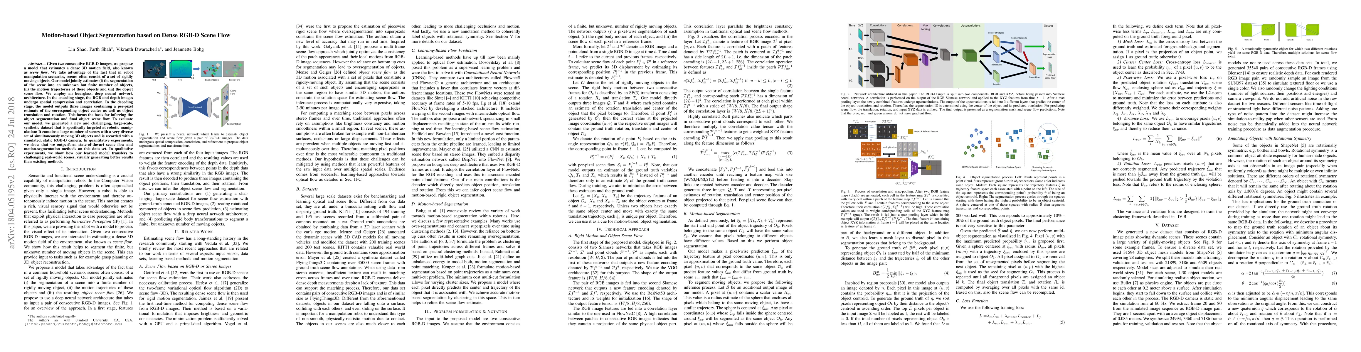 Given two consecutive RGB-D images, we propose a model that estimates a dense 3D motion field, also known as scene flow. We take advantage of the fact that in robot manipulation scenarios, scenes often consist of a set of rigidly moving objects. Our model jointly estimates (i) the segmentation of the scene into an unknown but finite number of objects, (ii) the motion trajectories of these objects and (iii) the object scene flow. We employ an hourglass, deep neural network architecture. In the encoding stage, the RGB and depth images undergo spatial compression and correlation. In the decoding stage, the model outputs three images containing a per-pixel estimate of the corresponding object center as well as object translation and rotation. This forms the basis for inferring the object segmentation and final object scene flow. To evaluate our model, we generated a new and challenging, large-scale, synthetic dataset that is specifically targeted at robotic manipulation: It contains a large number of scenes with a very diverse set of simultaneously moving 3D objects and is recorded with a simulated, static RGB-D camera. In quantitative experiments, we show that we outperform state-of-the-art scene flow and motion-segmentation methods on this data set. In qualitative experiments, we show how our learned model transfers to challenging real-world scenes, visually generating better results than existing methods.