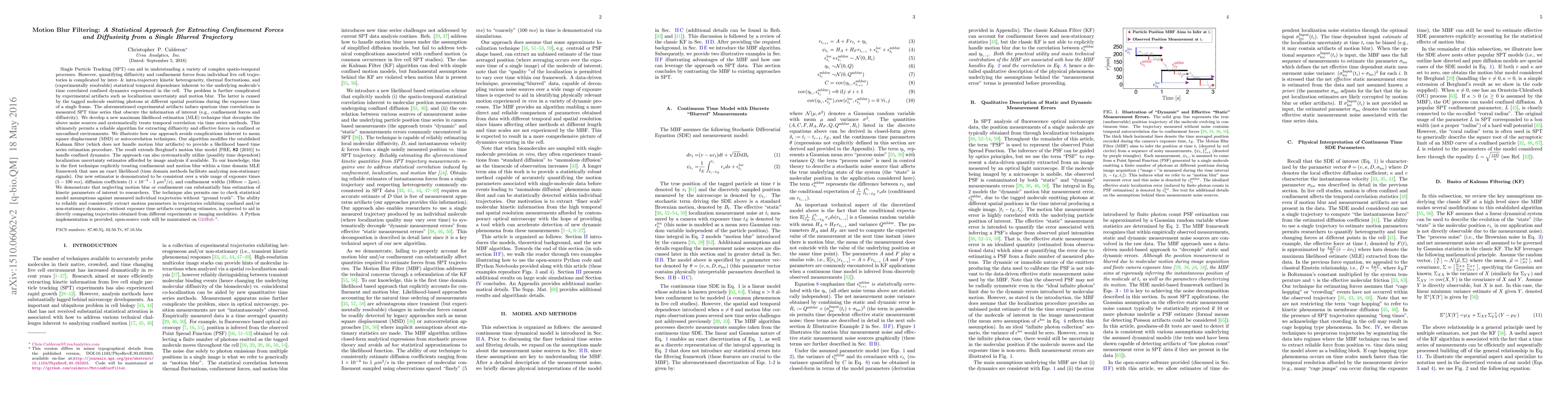 Single Particle Tracking (SPT) can aid in understanding complex spatio-temporal processes. However, quantifying diffusivity and forces from individual live cell trajectories is complicated by inter- & intra-trajectory kinetic heterogeneity, thermal fluctuations, and statistical temporal dependence inherent to the underlying molecule's time correlated confined dynamics experienced in the cell. Experimental artifacts such as localization uncertainty and motion blur also obscure the data. We introduce a new maximum likelihood estimation (MLE) technique that decouples the above noise sources and systematically treats temporal correlation via a likelihood function (permitting more reliable extraction of effective forces from position vs. time data). Our estimator is demonstrated to be consistent over a wide range of exposure times, diffusion coefficients, and confinement "radii". The algorithm and corresponding software can reliably extract motion parameters independent of exposure time in trajectories exhibiting confined and/or non-stationary dynamics and will aid in directly comparing trajectories obtained from different imaging modalities.