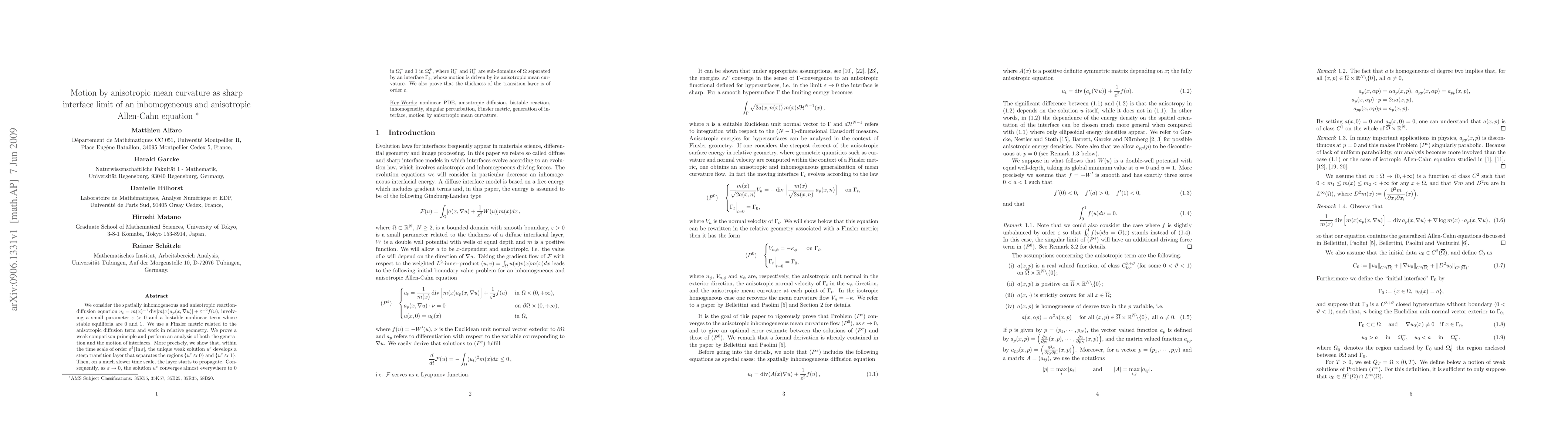 This paper studies the motion of interfaces in a spatially inhomogeneous reaction-diffusion equation as it approaches a sharp interface limit involving motion by anisotropic mean curvature.