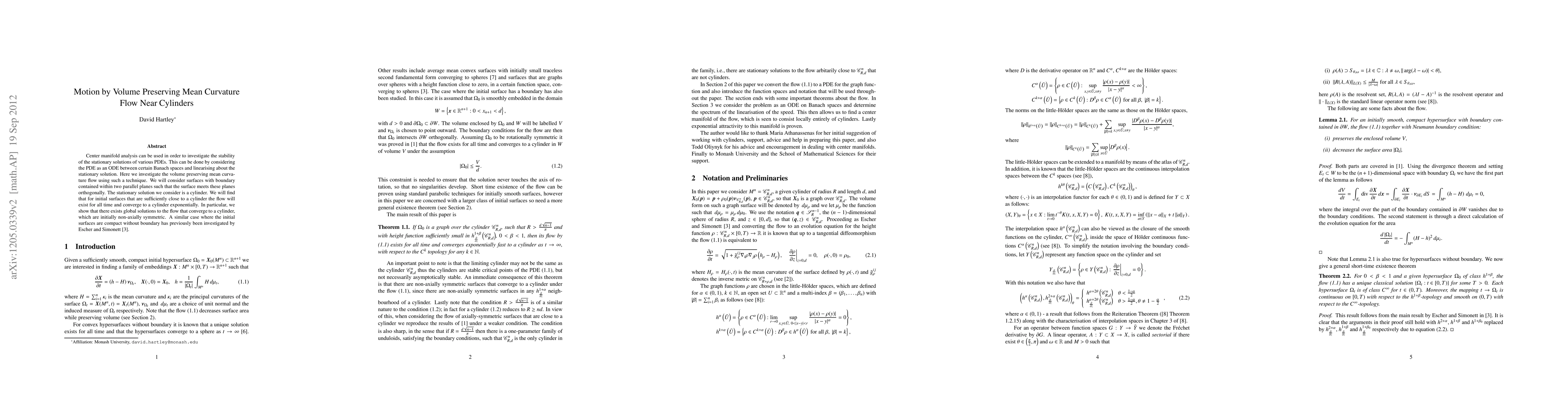 This paper uses center manifold analysis to study the stability of volume preserving mean curvature flow near cylindrical stationary solutions. It finds that initial surfaces close to a cylinder will converge to it exponentially for all time.