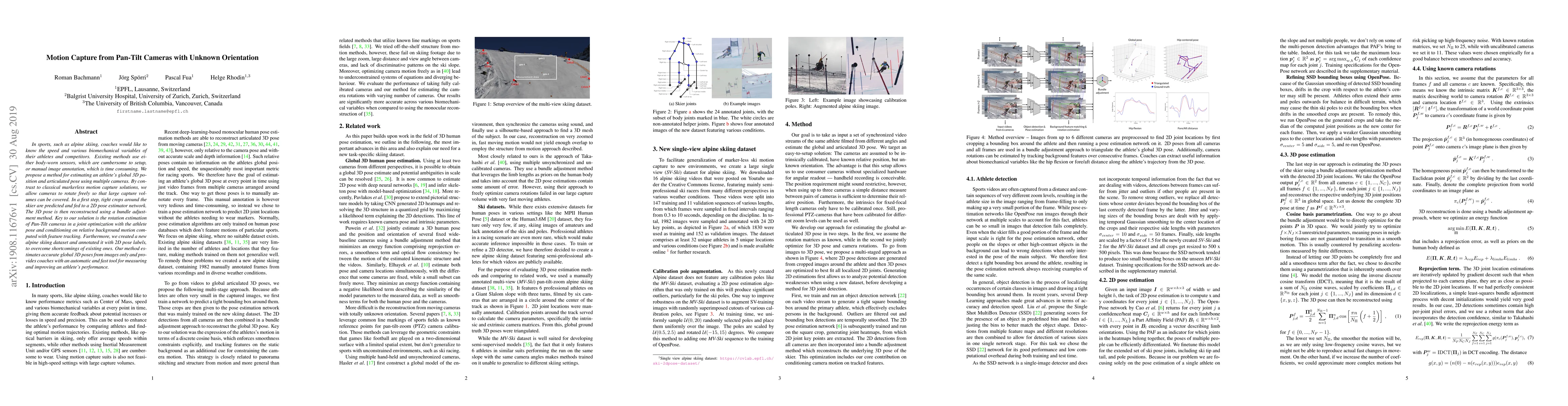 In sports, such as alpine skiing, coaches would like to know the speed and various biomechanical variables of their athletes and competitors. Existing methods use either body-worn sensors, which are cumbersome to setup, or manual image annotation, which is time consuming. We propose a method for estimating an athlete's global 3D position and articulated pose using multiple cameras. By contrast to classical markerless motion capture solutions, we allow cameras to rotate freely so that large capture volumes can be covered. In a first step, tight crops around the skier are predicted and fed to a 2D pose estimator network. The 3D pose is then reconstructed using a bundle adjustment method. Key to our solution is the rotation estimation of Pan-Tilt cameras in a joint optimization with the athlete pose and conditioning on relative background motion computed with feature tracking. Furthermore, we created a new alpine skiing dataset and annotated it with 2D pose labels, to overcome shortcomings of existing ones. Our method estimates accurate global 3D poses from images only and provides coaches with an automatic and fast tool for measuring and improving an athlete's performance.