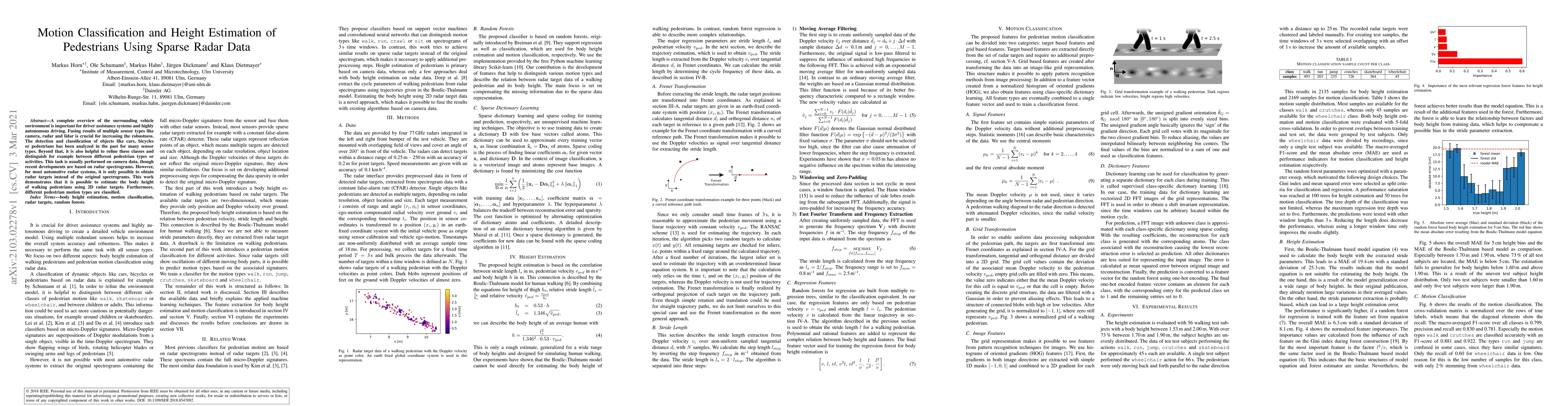 This paper explores the classification of pedestrian motion types and estimation of pedestrian height using sparse radar data, demonstrating the potential of radar systems to augment driver assistance and autonomous driving systems by providing robust object detection and classification.