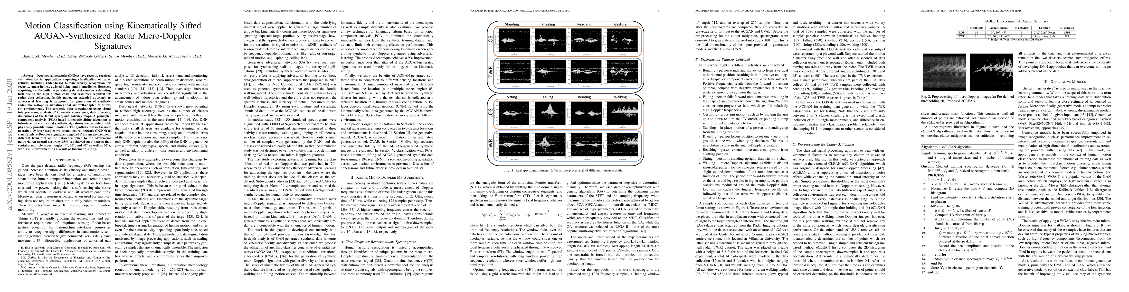 This paper proposes a method using adversarial learning to generate synthetic radar micro-Doppler signatures, employing kinematic-sifting to ensure realistic human motion consistency. The synthetic data enhances a DCNN classifier achieving 93% accuracy on a diverse test dataset.
